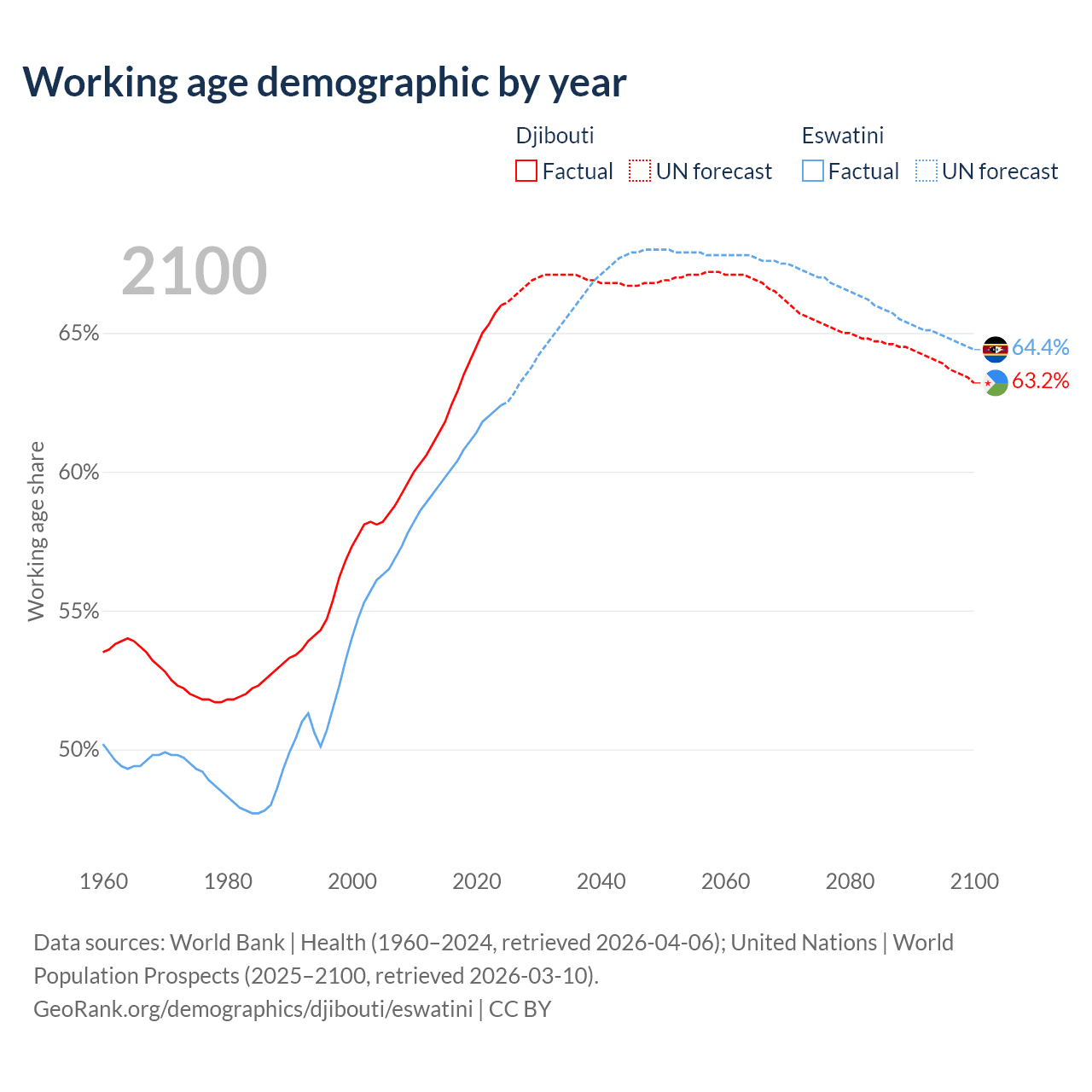 - Djibouti has 794K working age adults (aged 15-64) vs 794K in Eswatini.