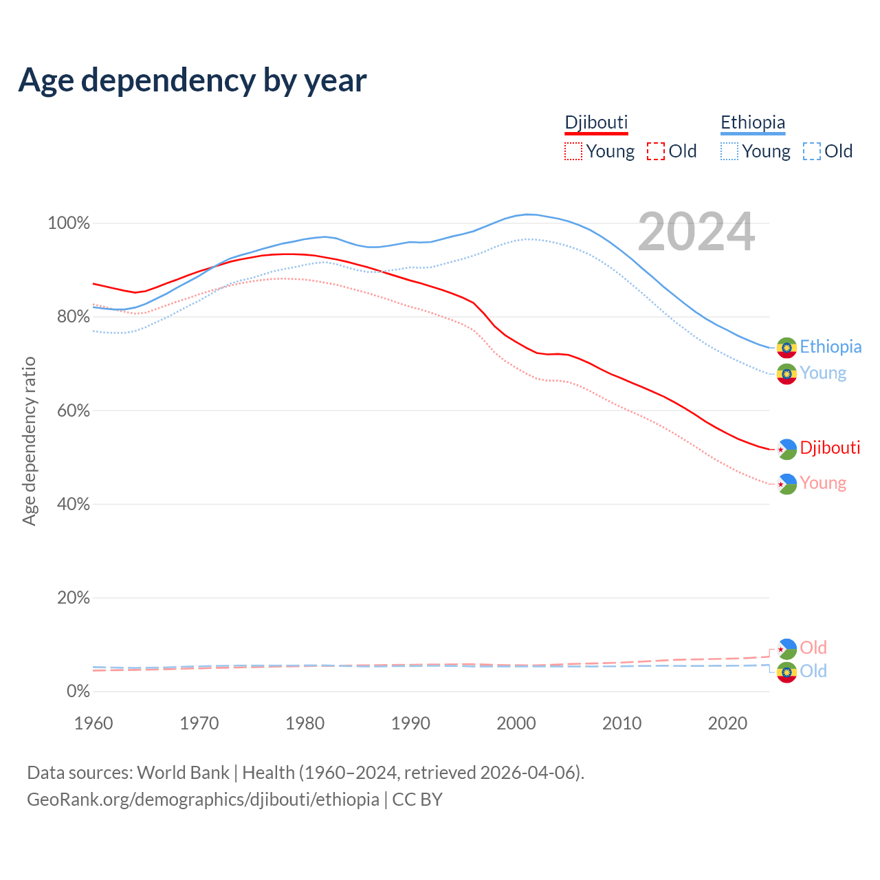 - The share of old-age demographic (65+) in Djibouti is 4.85% vs 3.23% in Ethiopia.