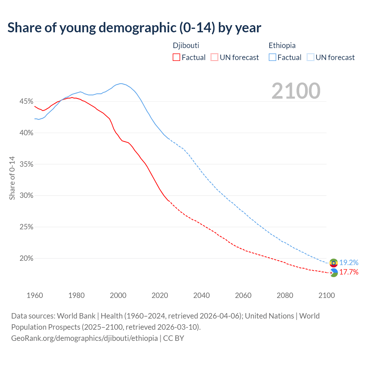 - The share of young demographic (0-15 years old) in Djibouti is 29.2% vs 39.1% in Ethiopia.