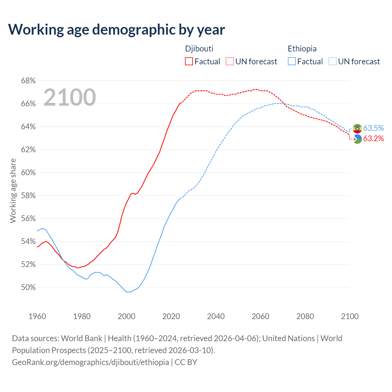 - Djibouti has 794K working age adults (aged 15-64) vs 80.7M in Ethiopia.