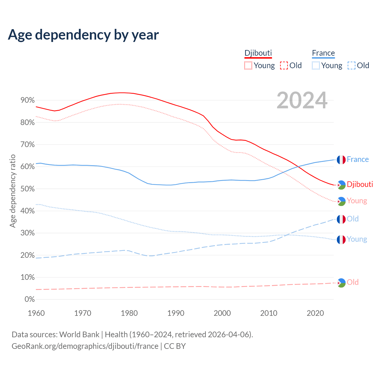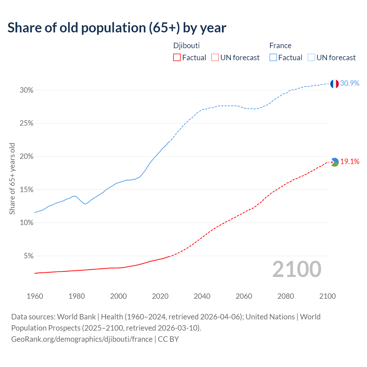 - The share of old-age demographic (65+) in Djibouti is 4.85% vs 22.1% in France.