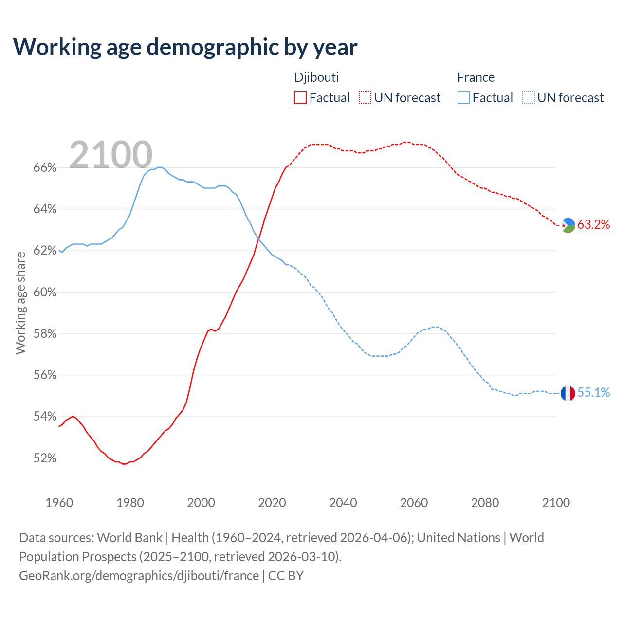 - Djibouti has 794K working age adults (aged 15-64) vs 42.2M in France.