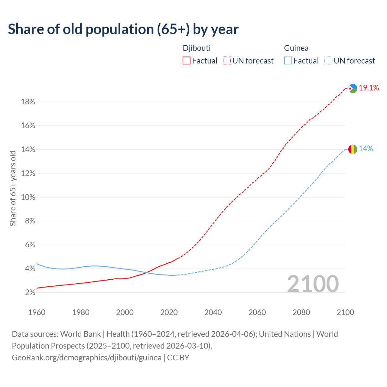 - The share of old-age demographic (65+) in Djibouti is 4.85% vs 3.46% in Guinea.