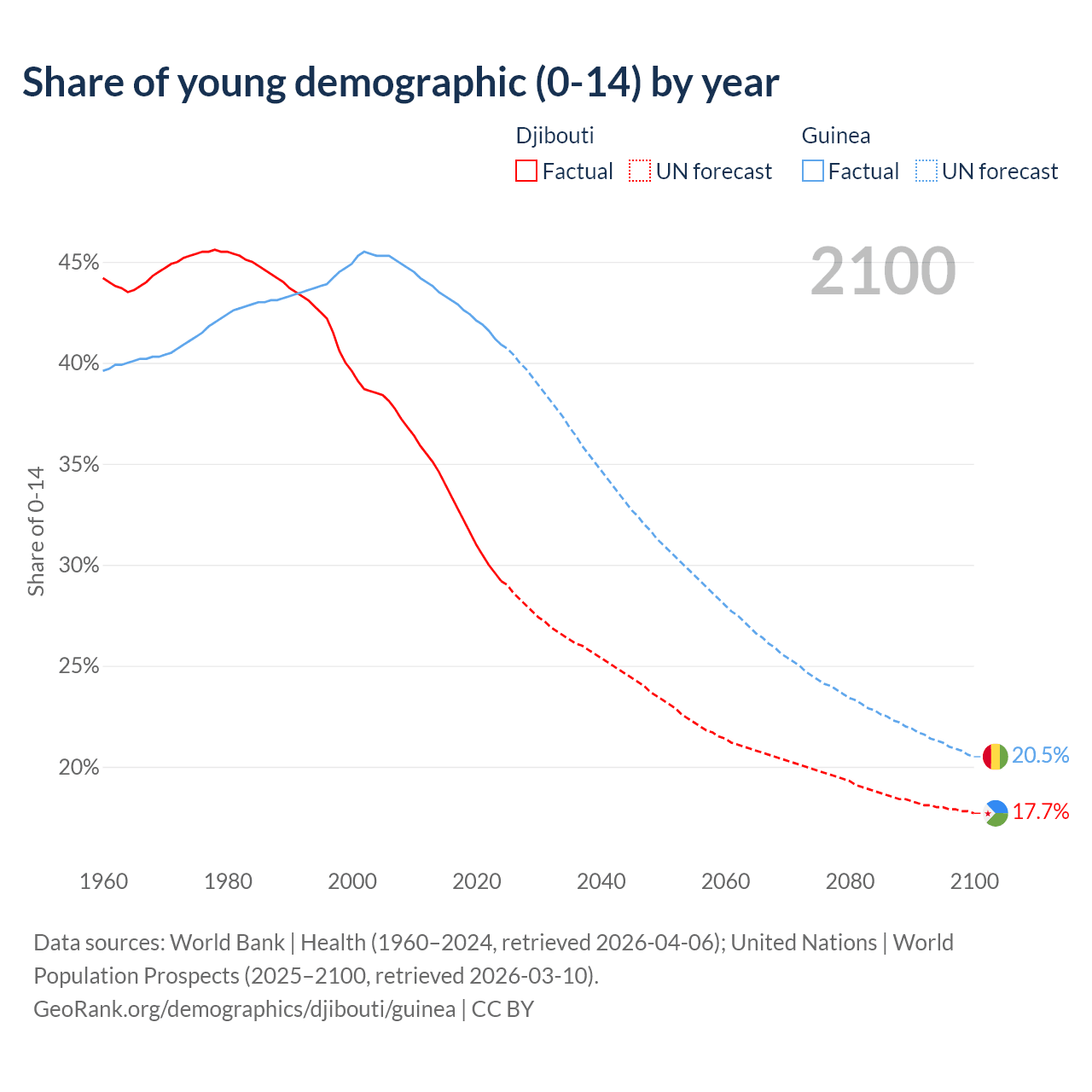 - The share of young demographic (0-15 years old) in Djibouti is 29.2% vs 40.9% in Guinea.