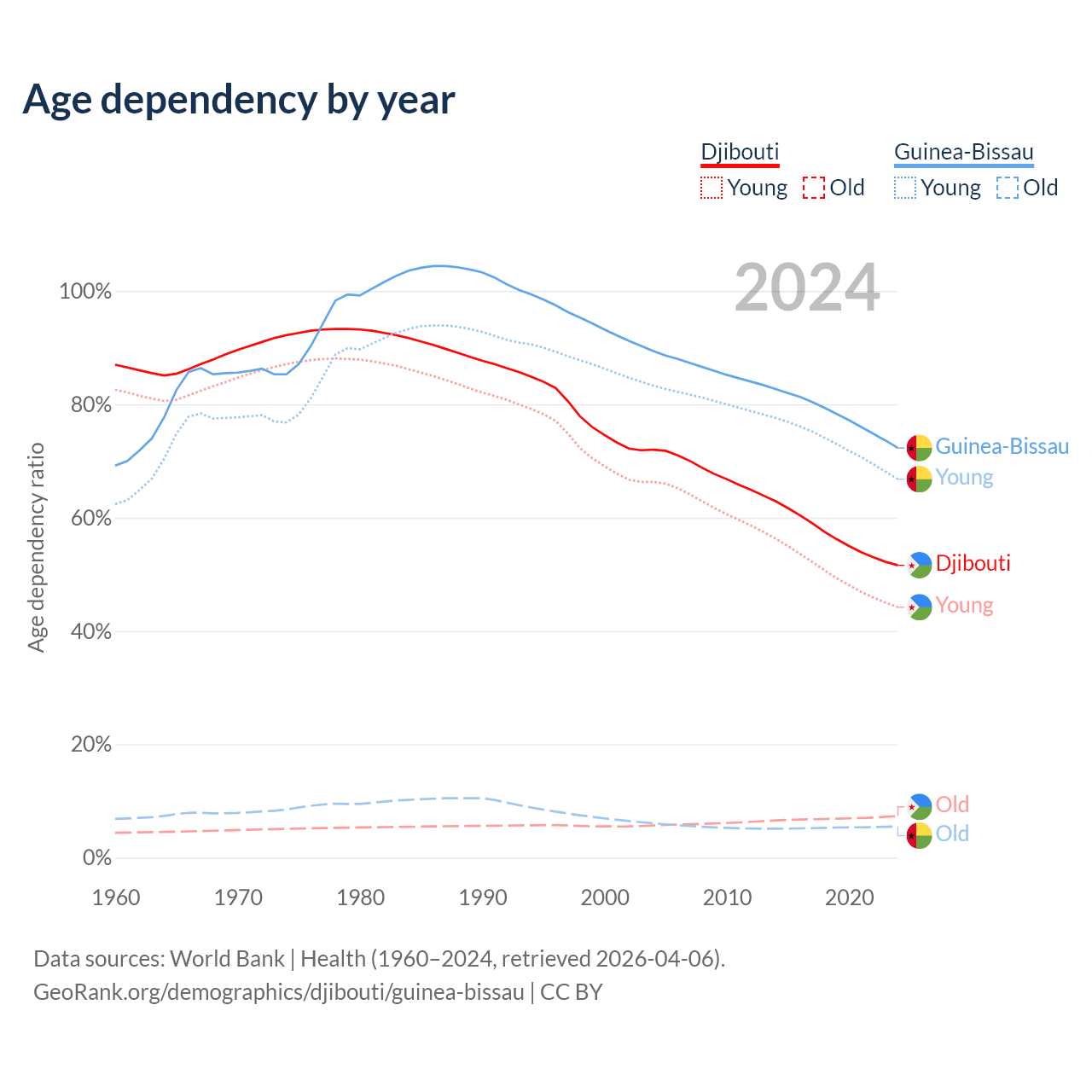 - The share of old-age demographic (65+) in Djibouti is 4.85% vs 3.19% in Guinea-Bissau.