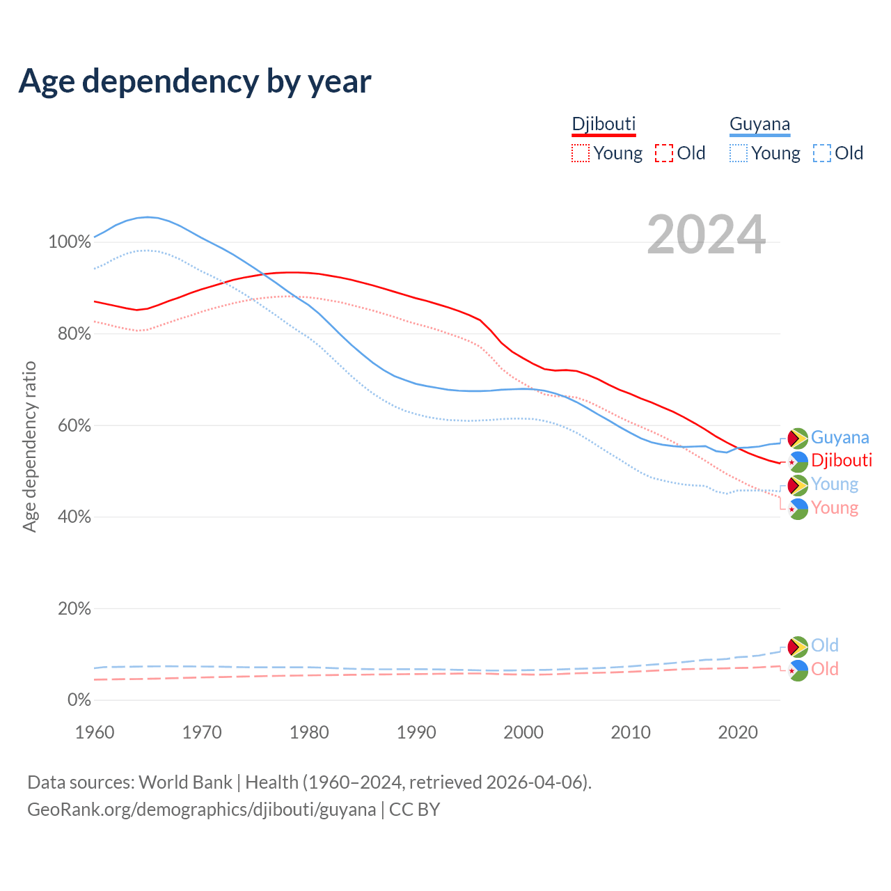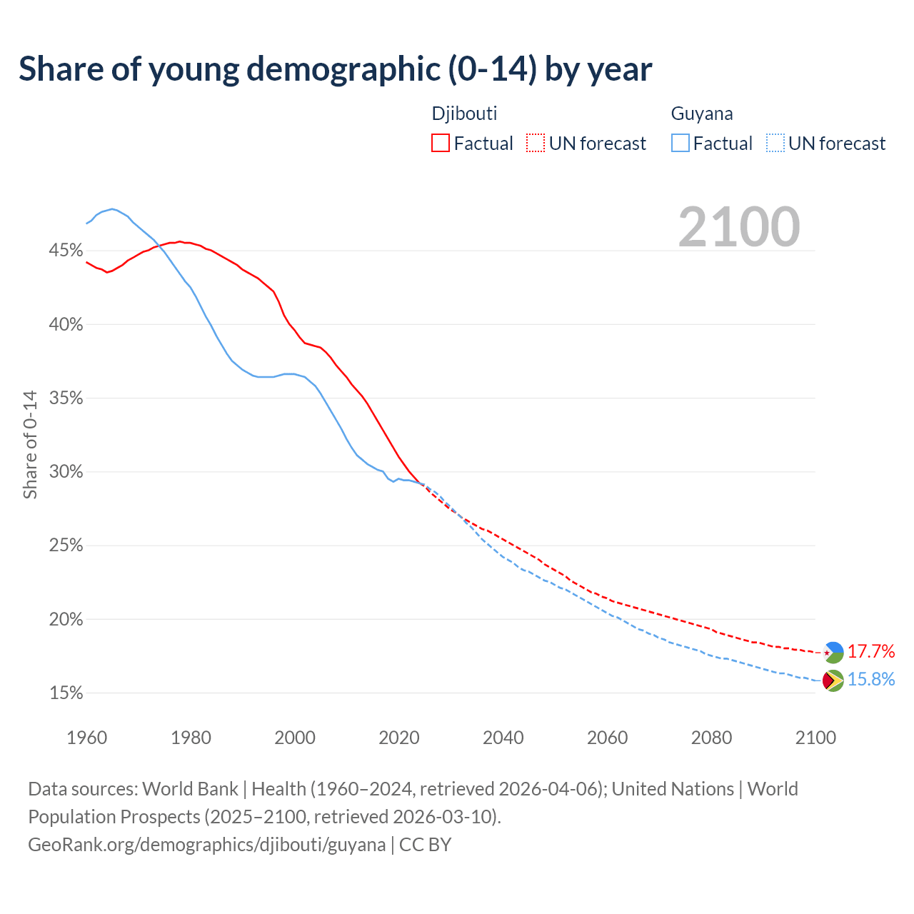 - The share of young demographic (0-15 years old) in Djibouti is 29.2% vs 29.2% in Guyana.
