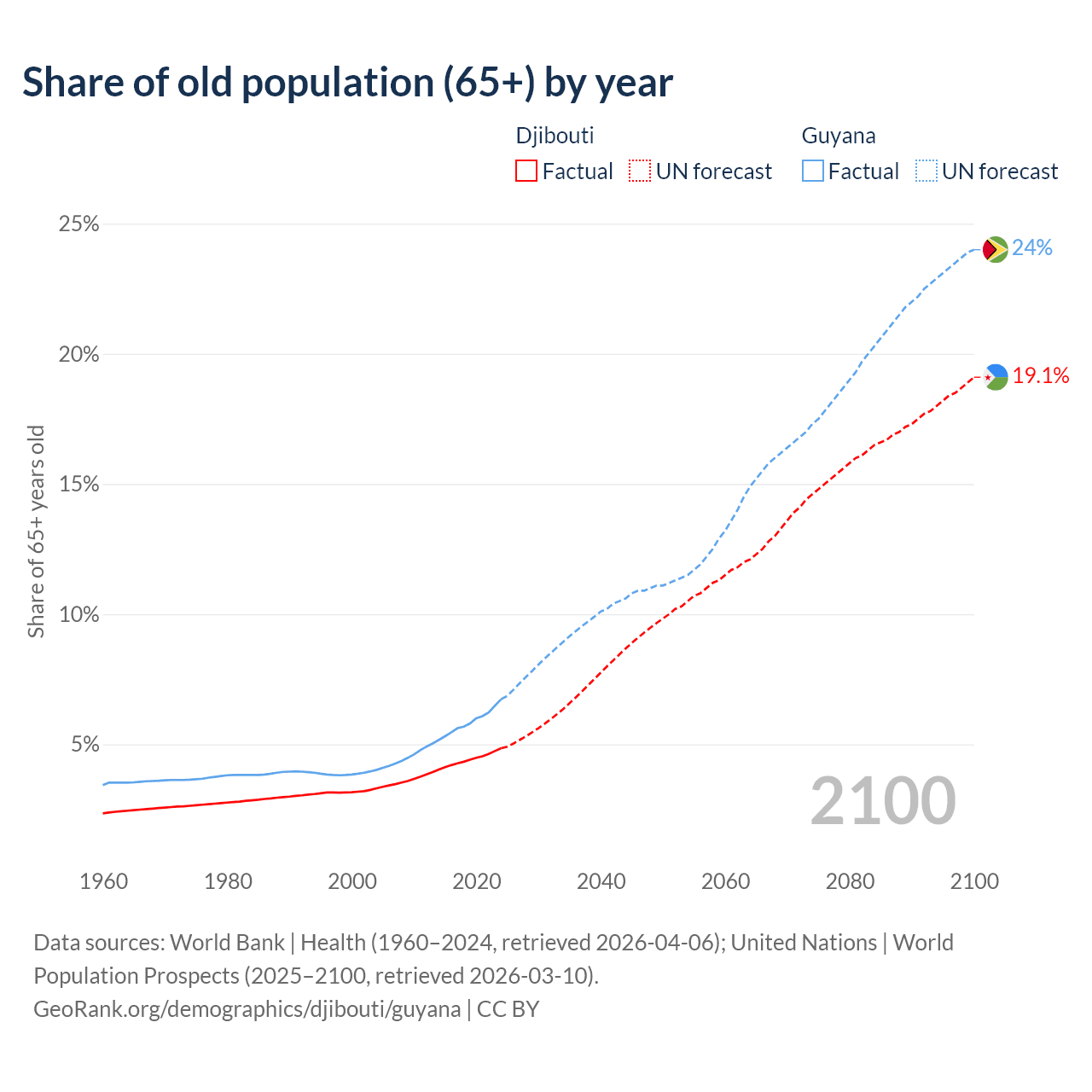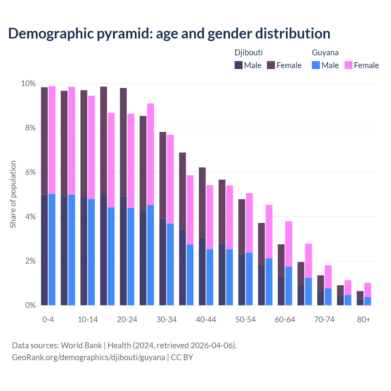 - The share of old-age demographic (65+) in Djibouti is 4.85% vs 6.73% in Guyana.