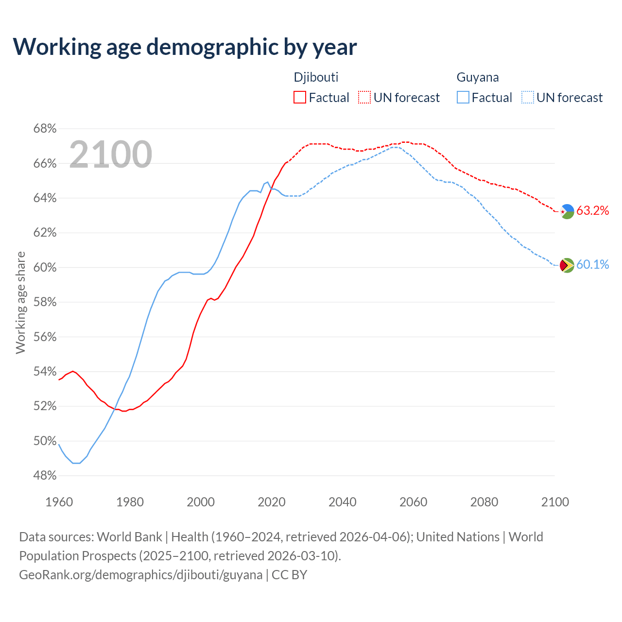 Median age Djibouti vs Guyana, 1960-2100