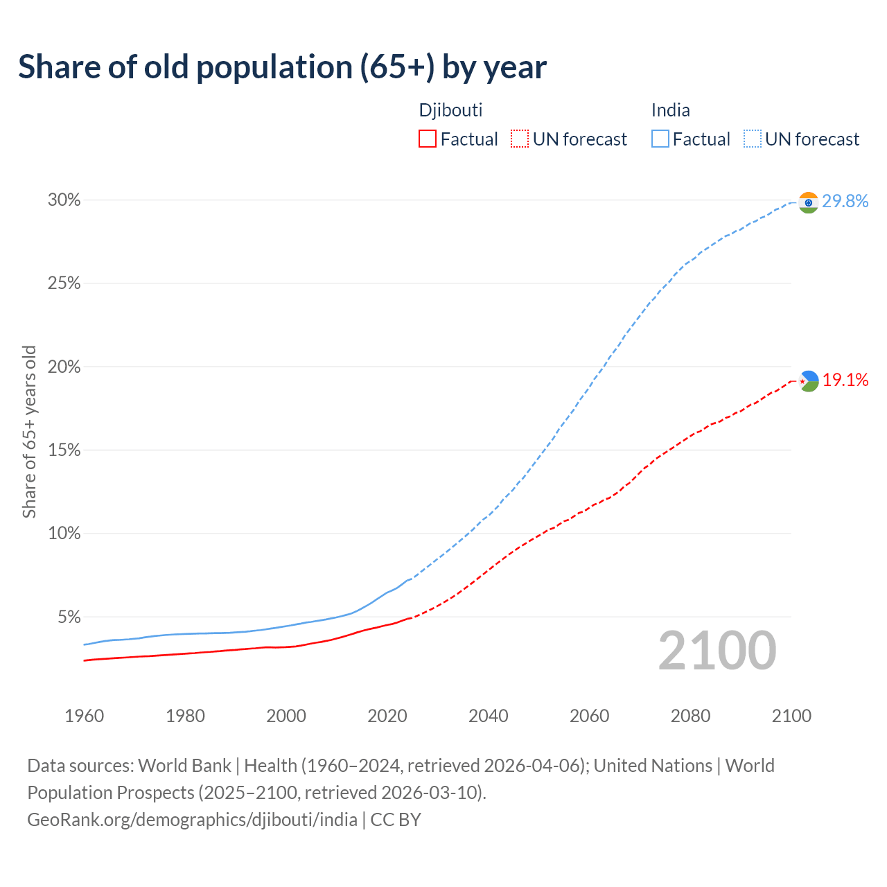 - The share of old-age demographic (65+) in Djibouti is 4.85% vs 7.15% in India.