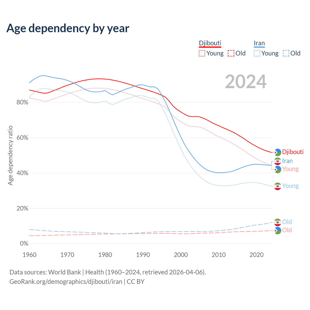 - The share of old-age demographic (65+) in Djibouti is 4.85% vs 8.24% in Iran.