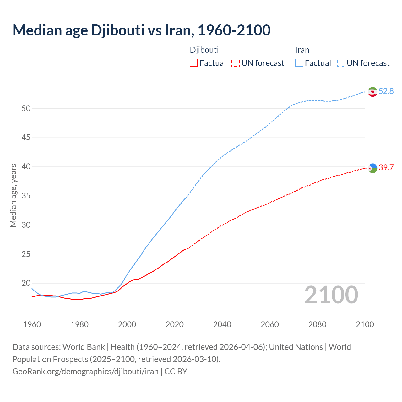 Median age Djibouti vs Iran, 1960-2100