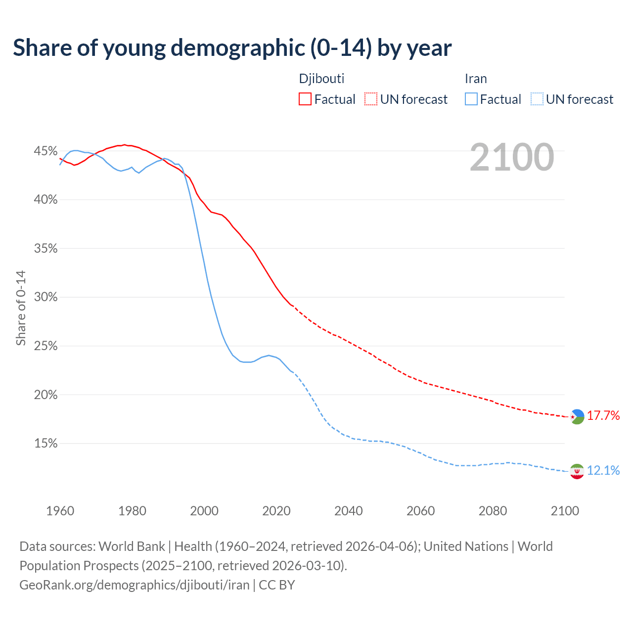 - The share of young demographic (0-15 years old) in Djibouti is 29.2% vs 22.4% in Iran.