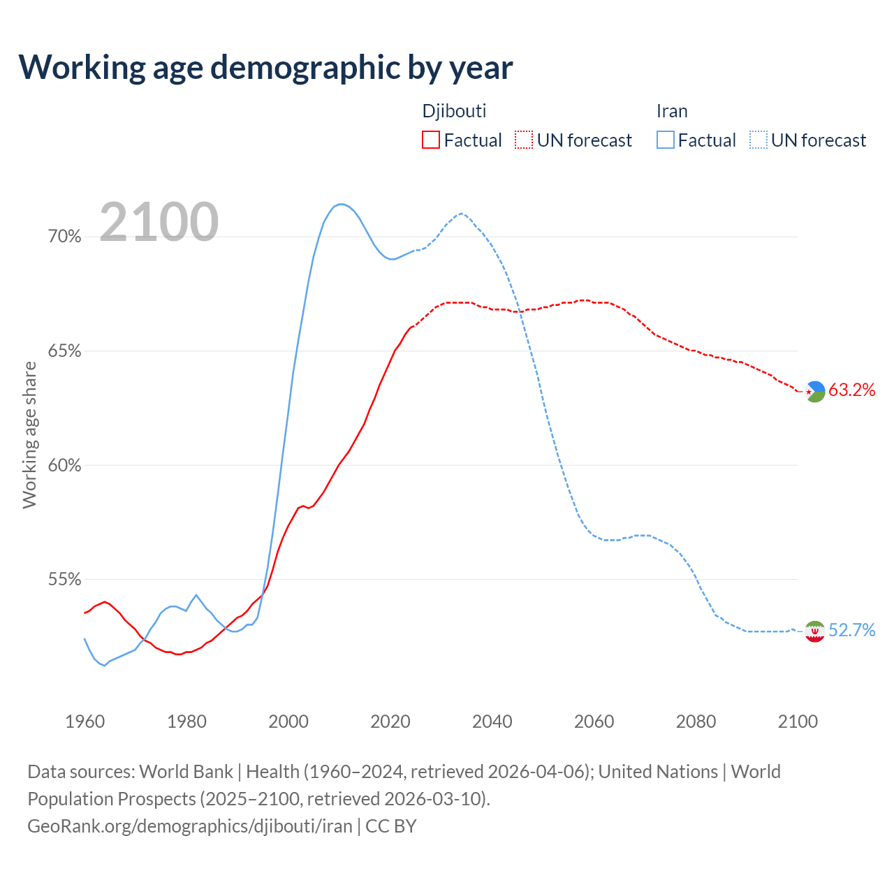 - Djibouti has 794K working age adults (aged 15-64) vs 64.8M in Iran.