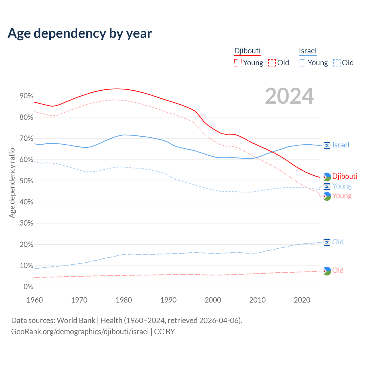 - The share of old-age demographic (65+) in Djibouti is 4.85% vs 12.6% in Israel.