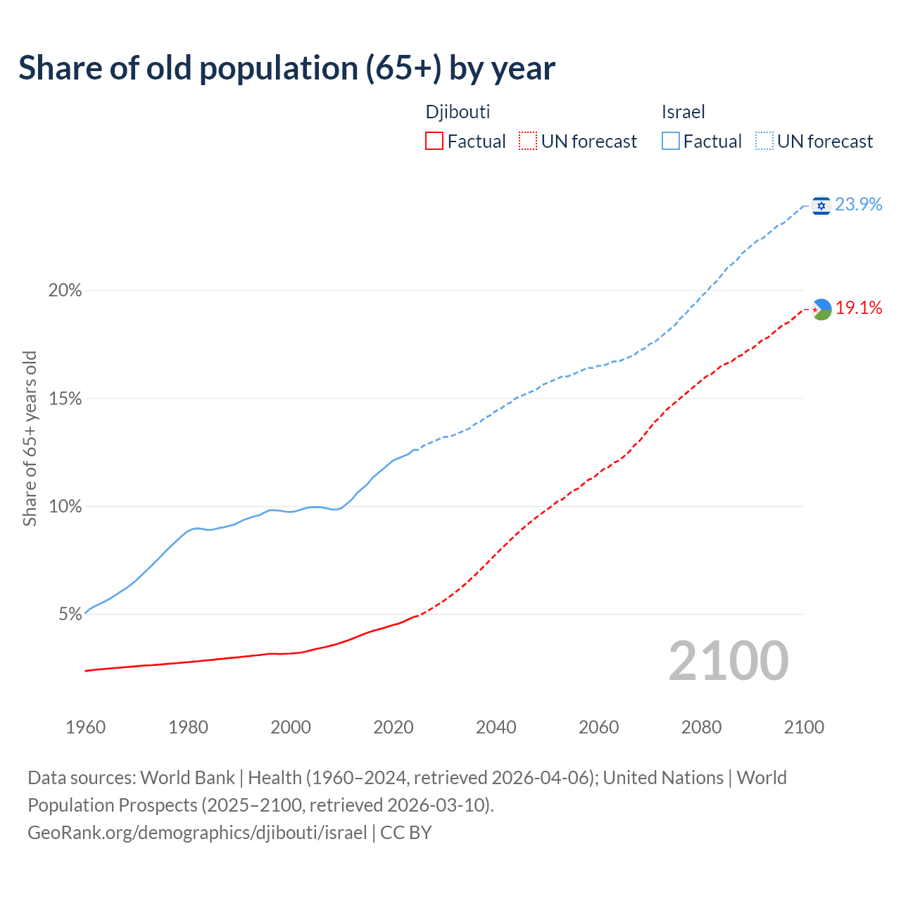 The share of older people aged 65 and over is 4.85% in Djibouti and 12.6% in Israel. Life expectancy in Djibouti compared to Israel .