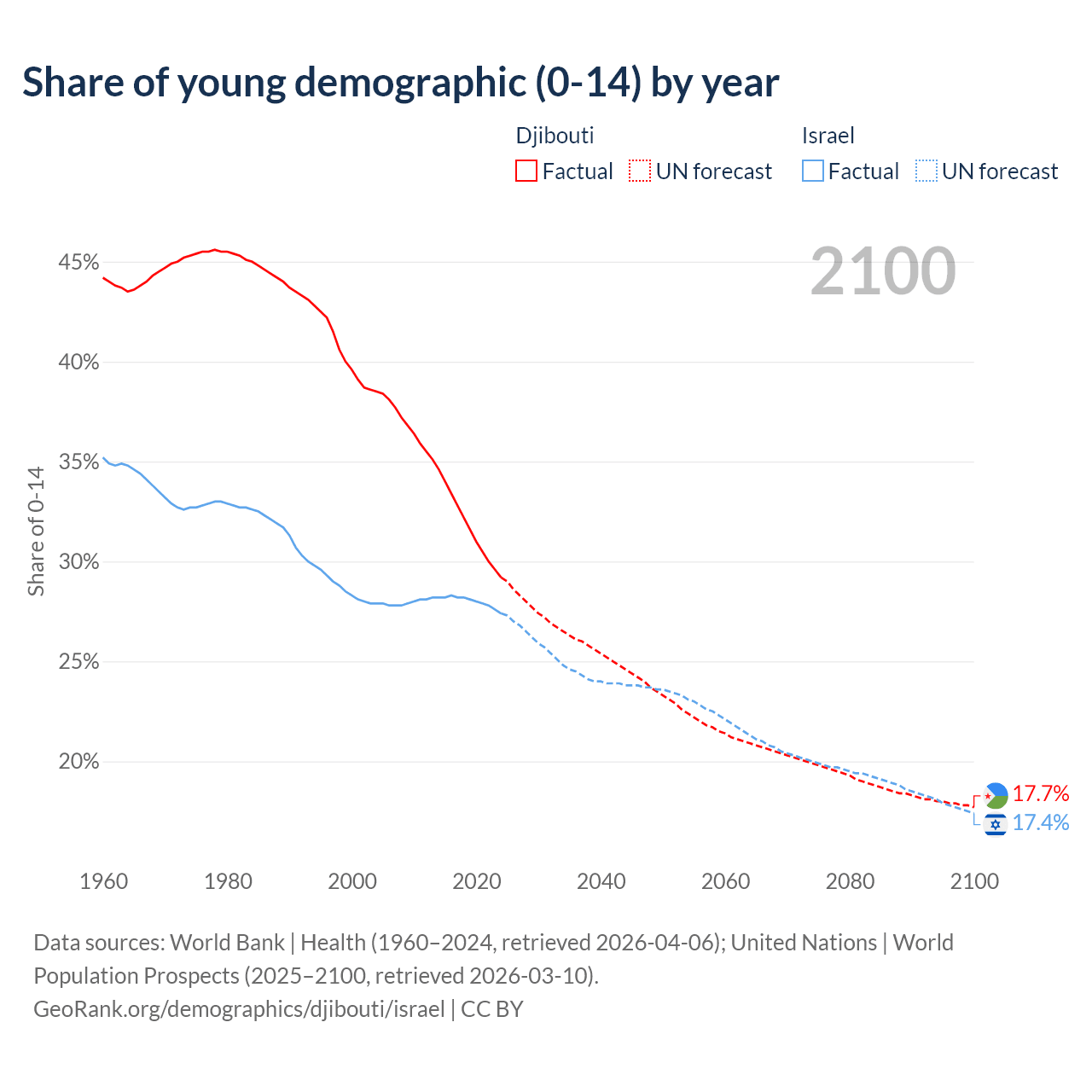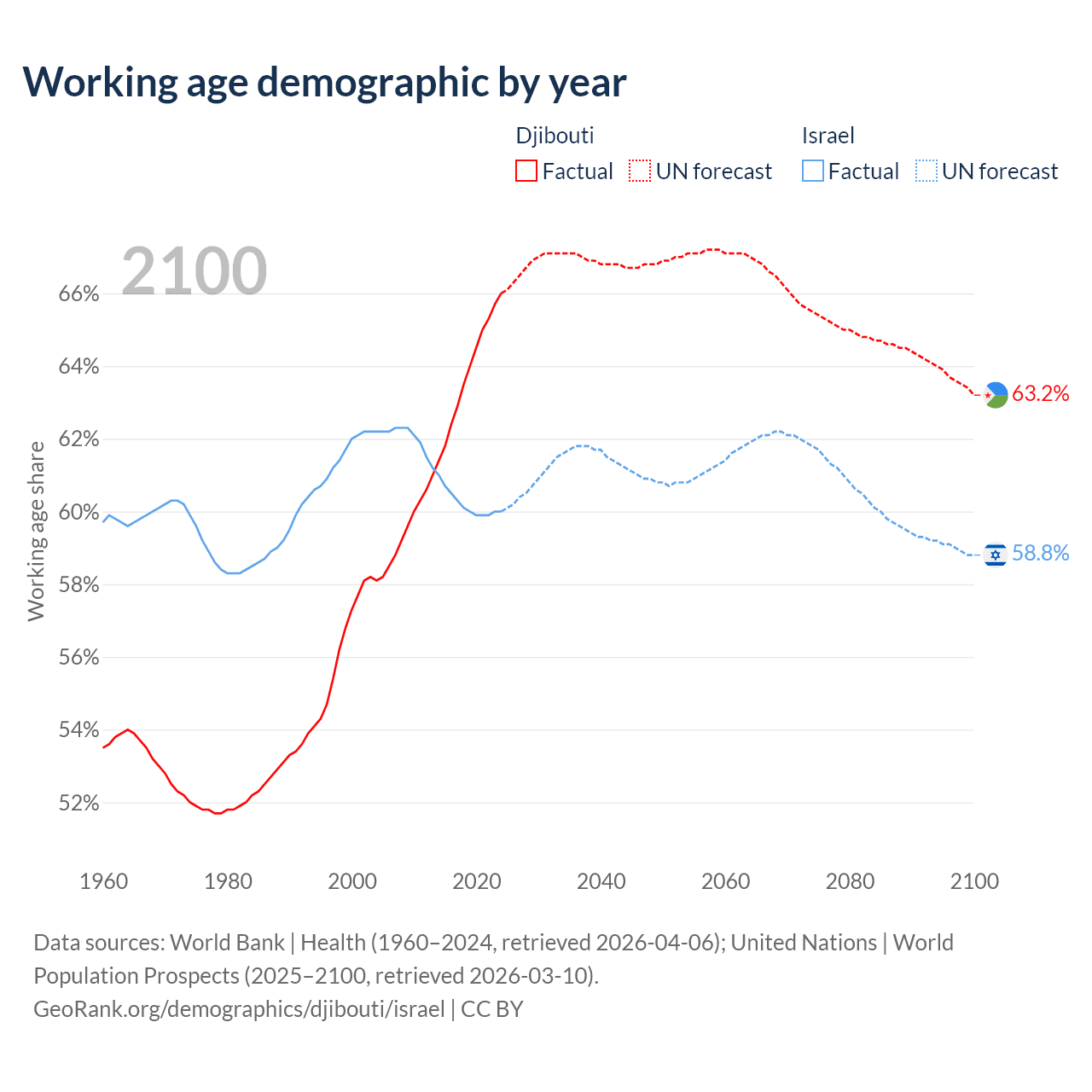 Median age Djibouti vs Israel, 1960-2100