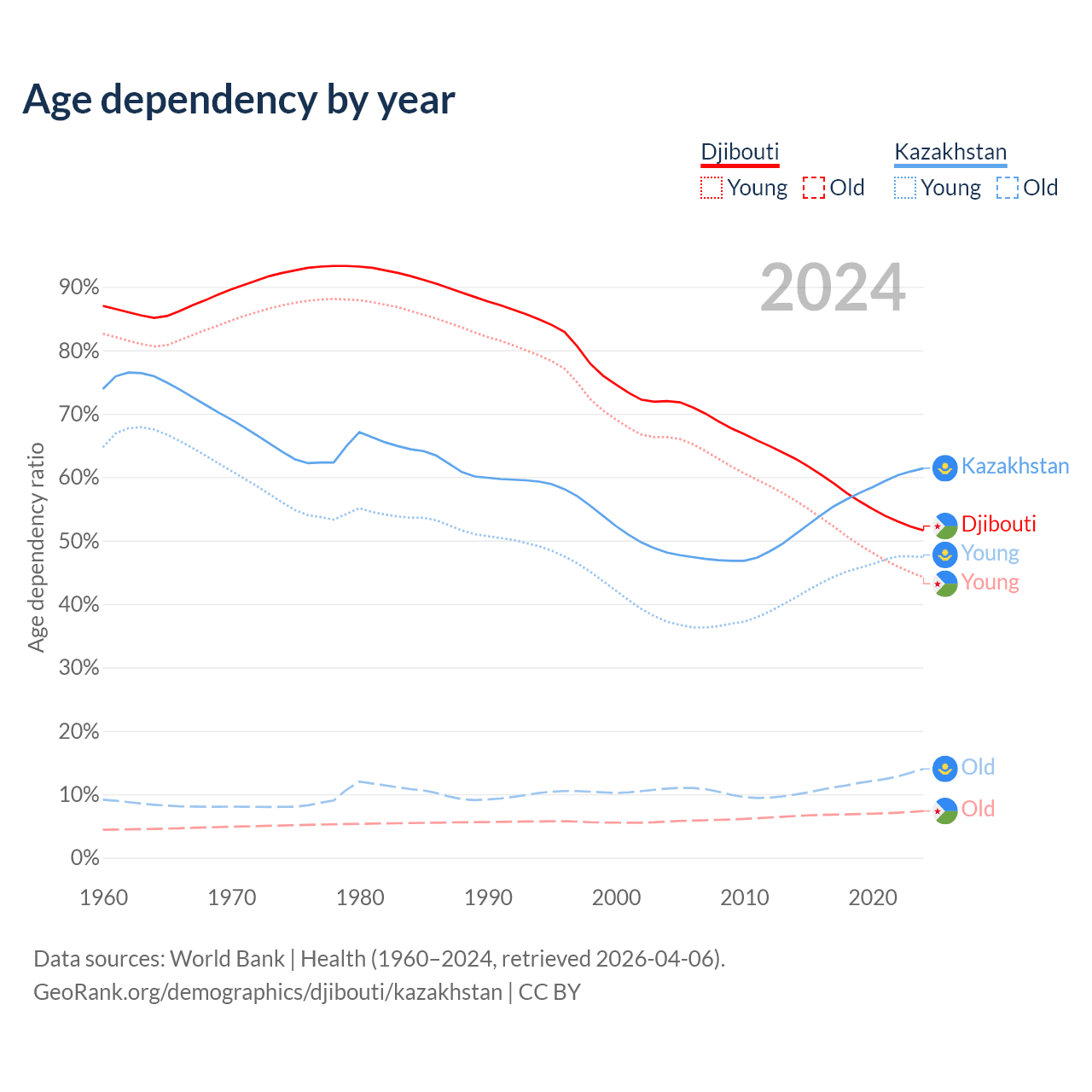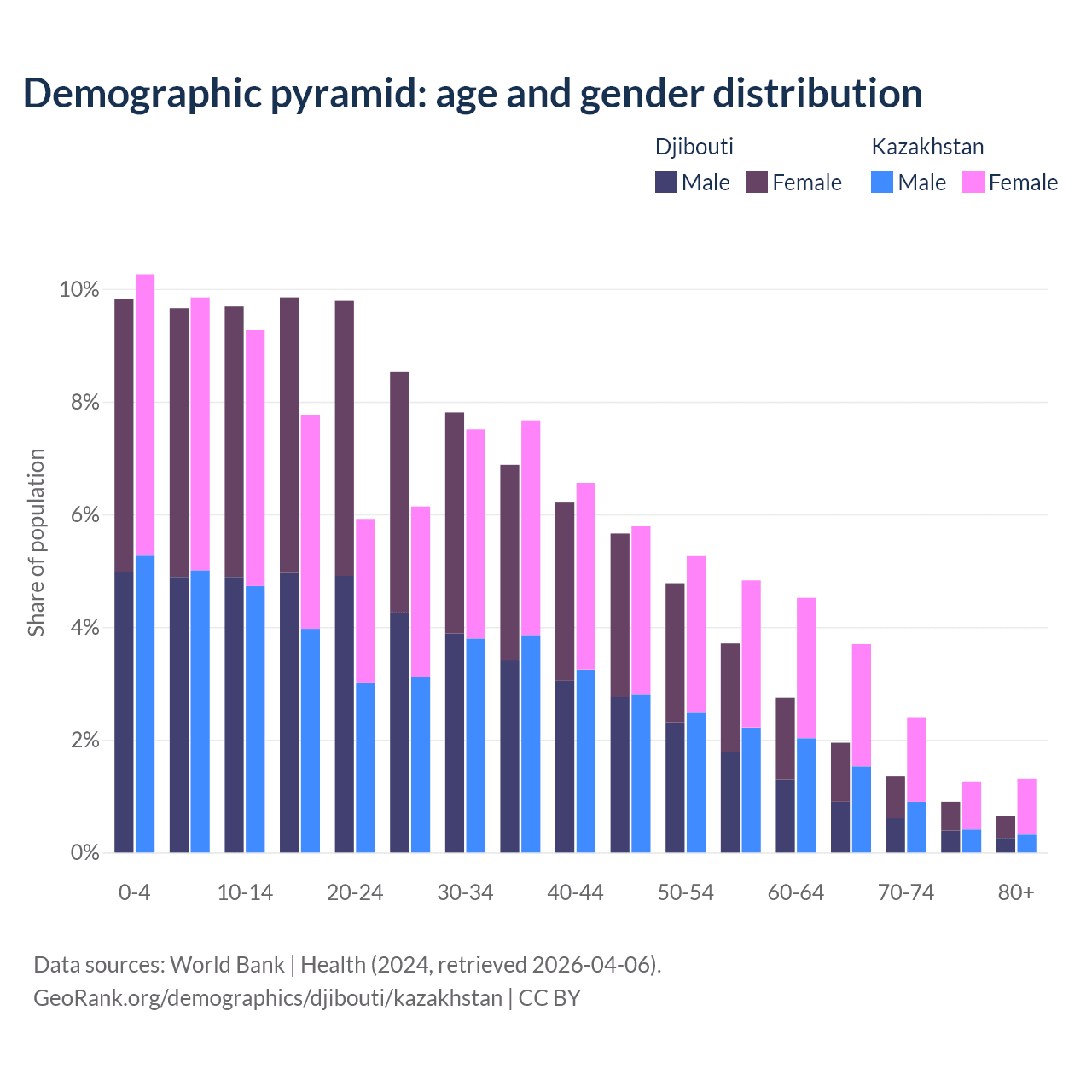 - Djibouti is ranked 129/196 by median age (oldest to youngest) vs 99/196 for Kazakhstan.