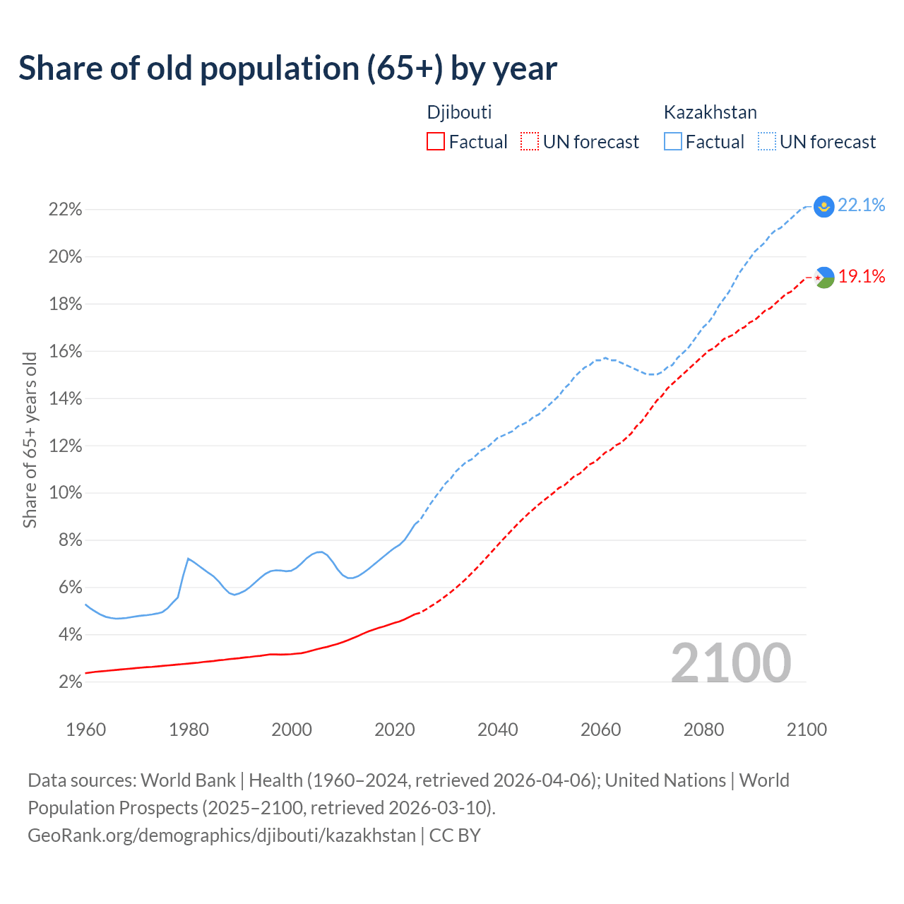 - The share of old-age demographic (65+) in Djibouti is 4.85% vs 8.65% in Kazakhstan.