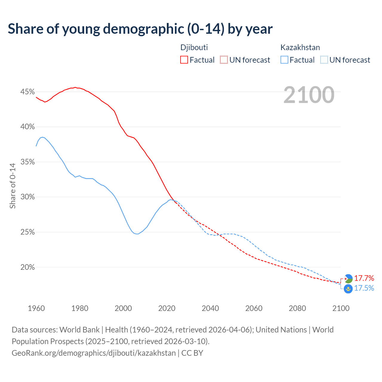 - The share of young demographic (0-15 years old) in Djibouti is 29.2% vs 29.4% in Kazakhstan.