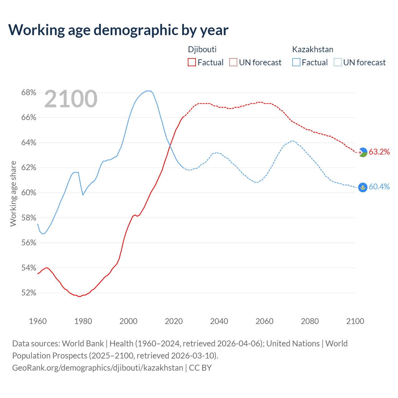 - Djibouti has 794K working age adults (aged 15-64) vs 13.1M in Kazakhstan.