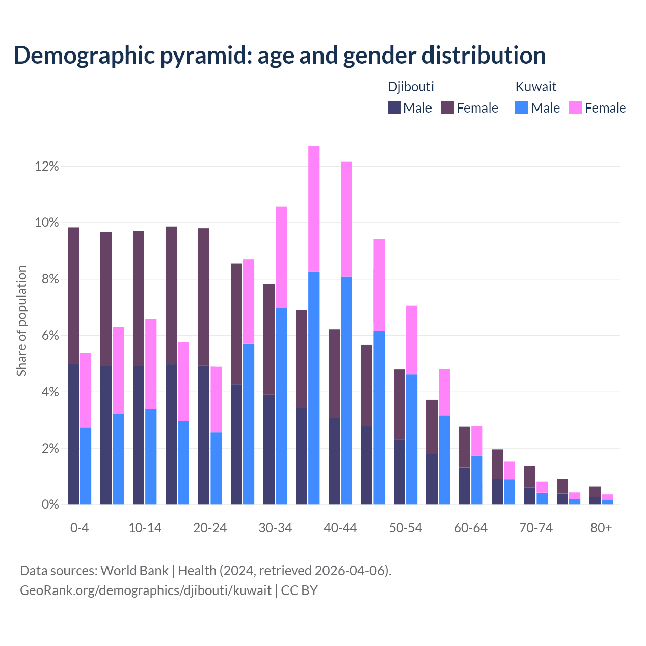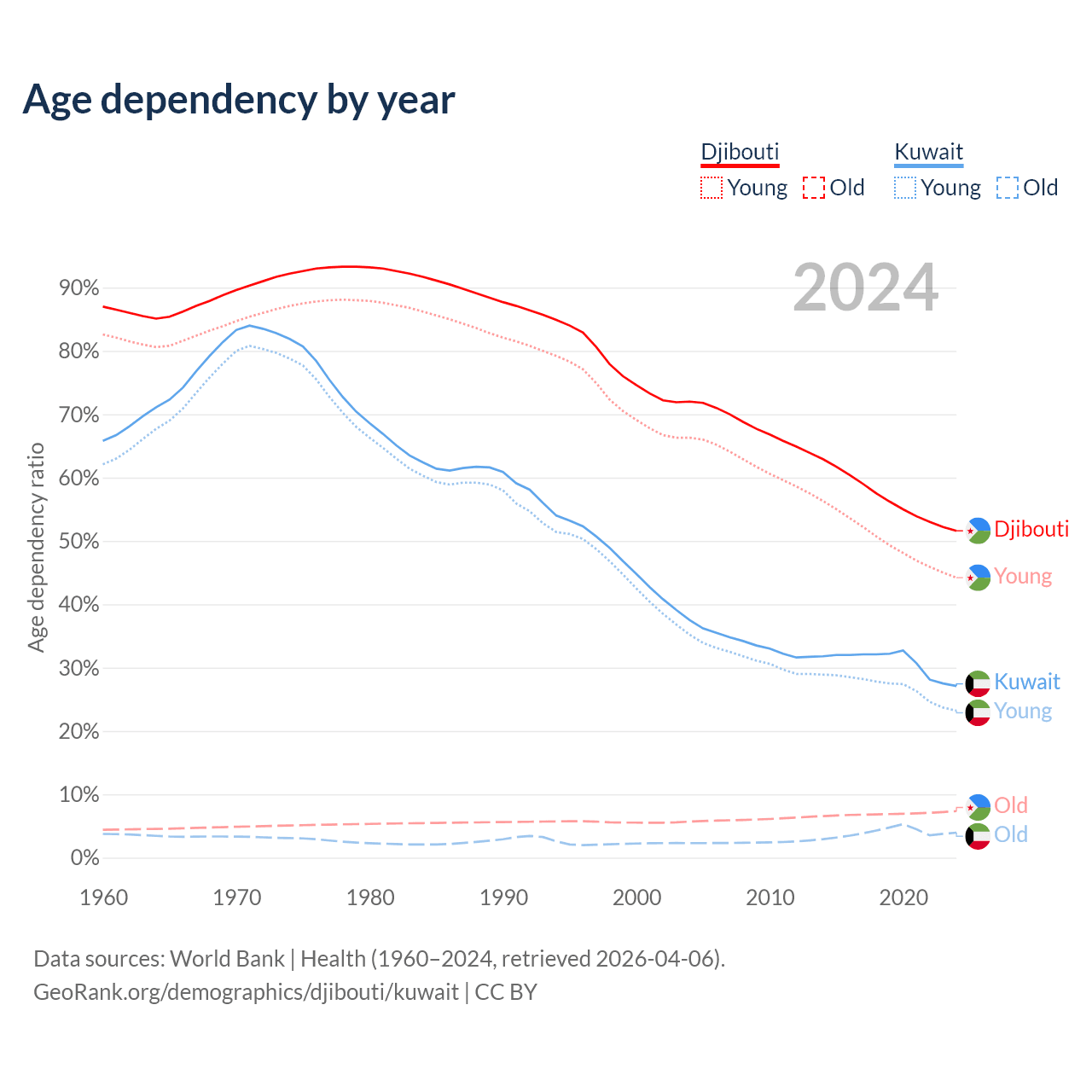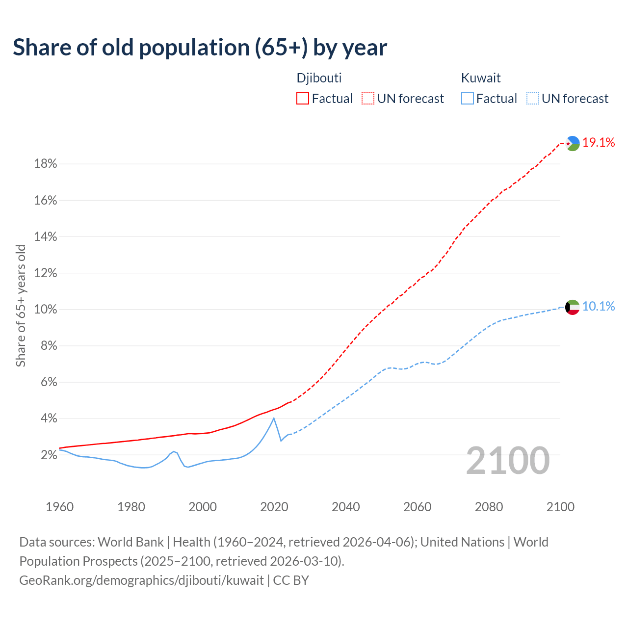 The share of older people aged 65 and over is 4.85% in Djibouti and 3.1% in Kuwait. Life expectancy in Djibouti compared to Kuwait .