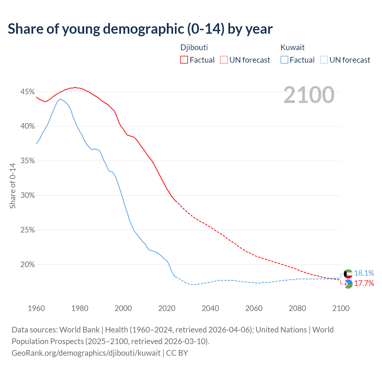 Median age Djibouti vs Kuwait, 1960-2100