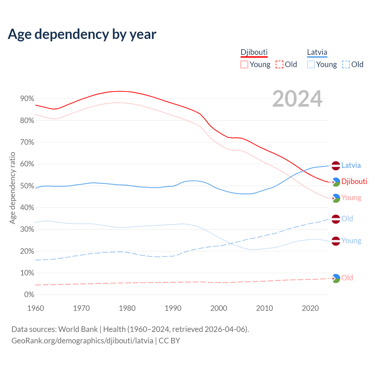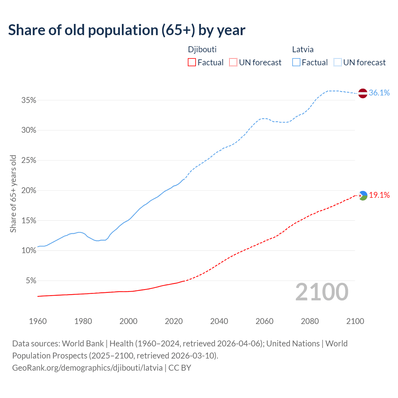 - The share of old-age demographic (65+) in Djibouti is 4.85% vs 21.7% in Latvia.