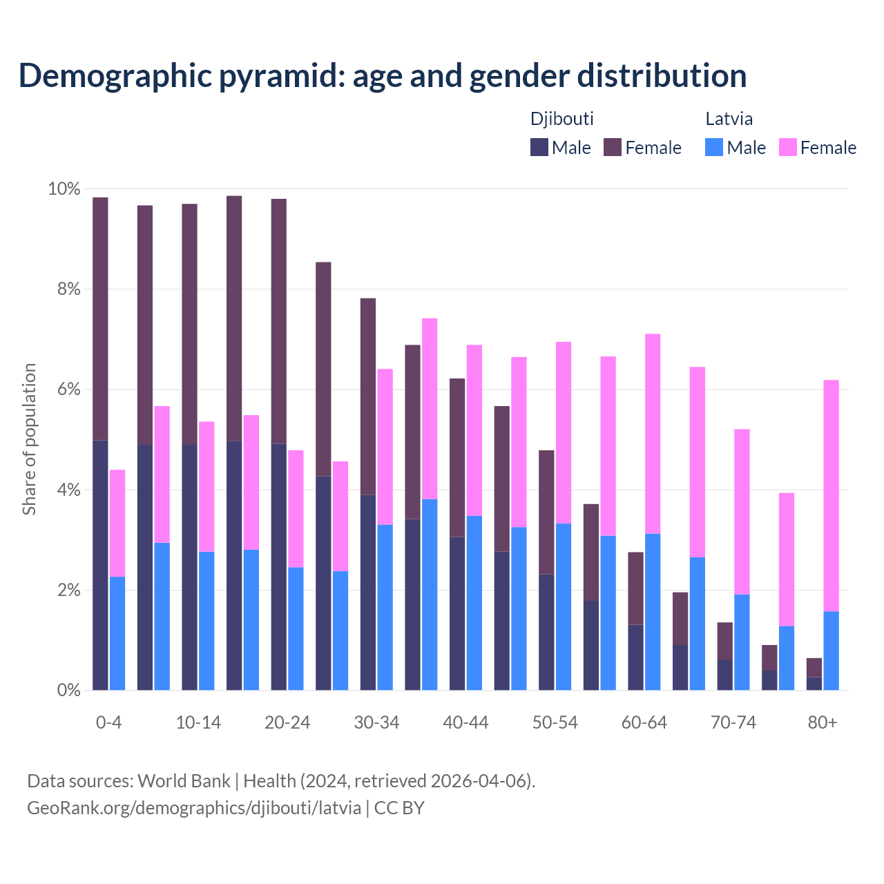 - Djibouti is ranked 129/196 by median age (oldest to youngest) vs 20/196 for Latvia.
