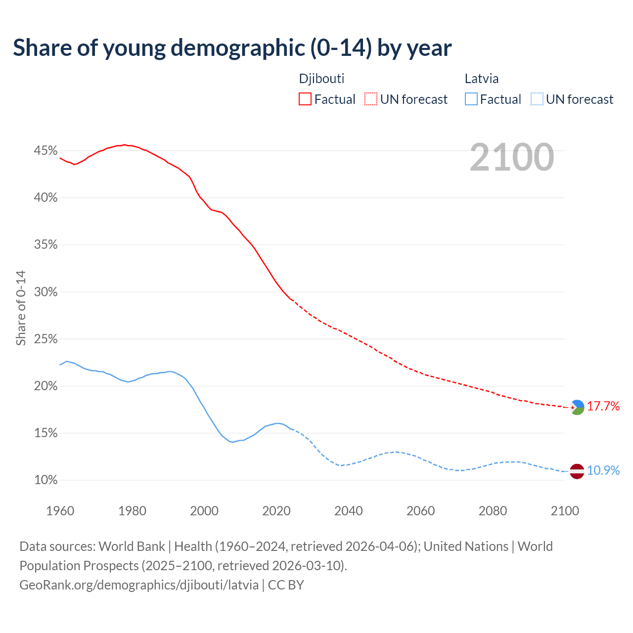 - The share of young demographic (0-15 years old) in Djibouti is 29.2% vs 15.4% in Latvia.