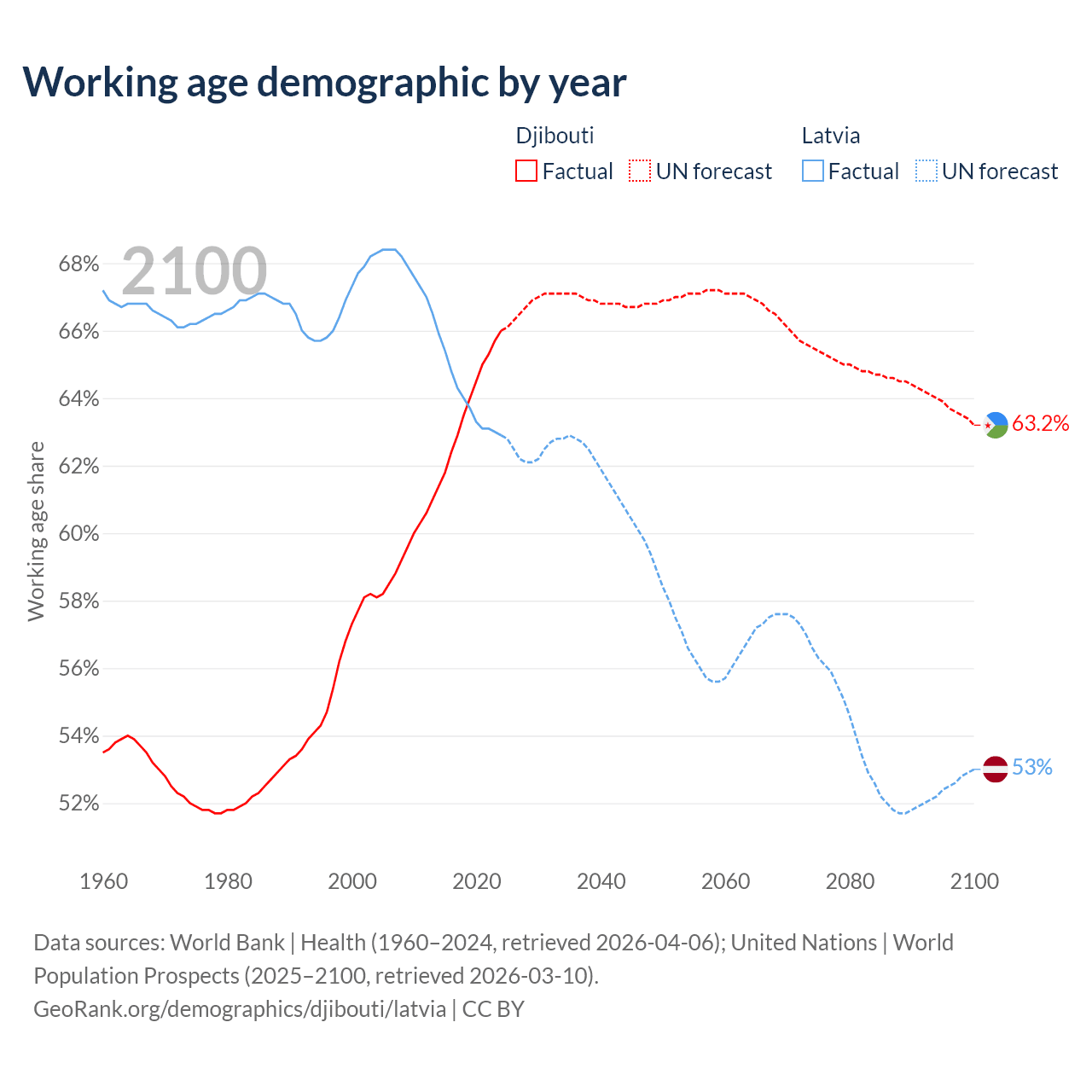 - Djibouti has 794K working age adults (aged 15-64) vs 1.15M in Latvia.