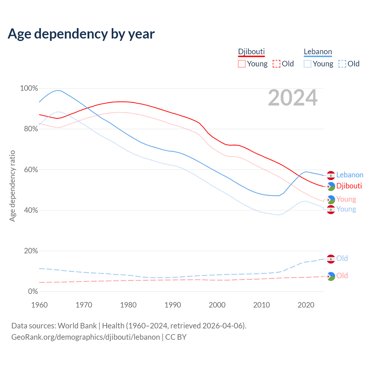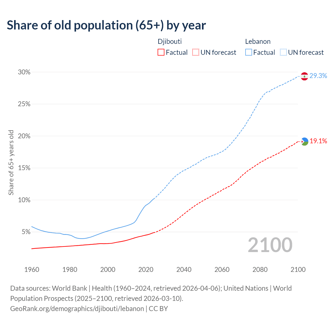 The share of older people aged 65 and over is 4.85% in Djibouti and 10.1% in Lebanon. Life expectancy in Djibouti compared to Lebanon .
