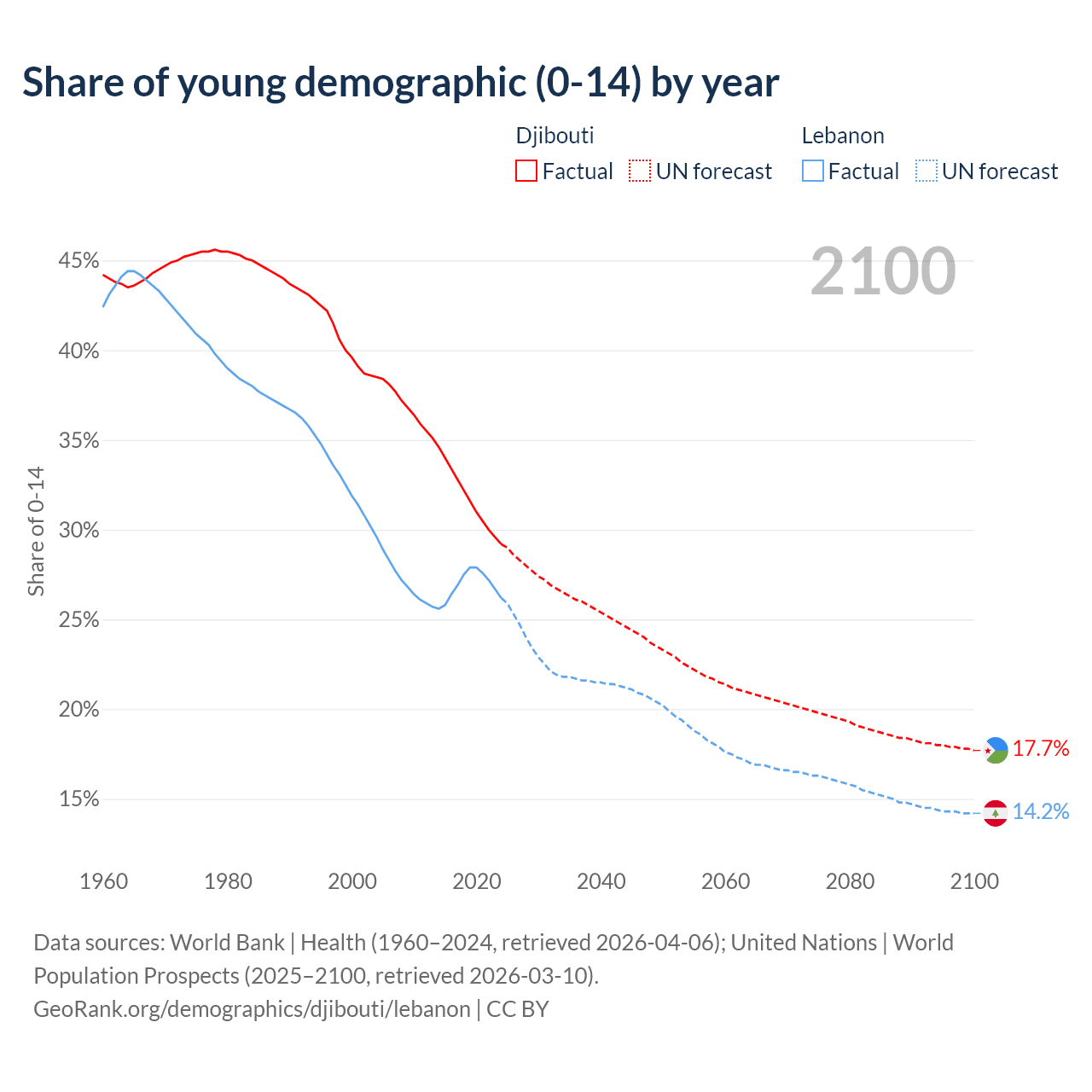 - The share of young demographic (0-15 years old) in Djibouti is 29.2% vs 26.2% in Lebanon.