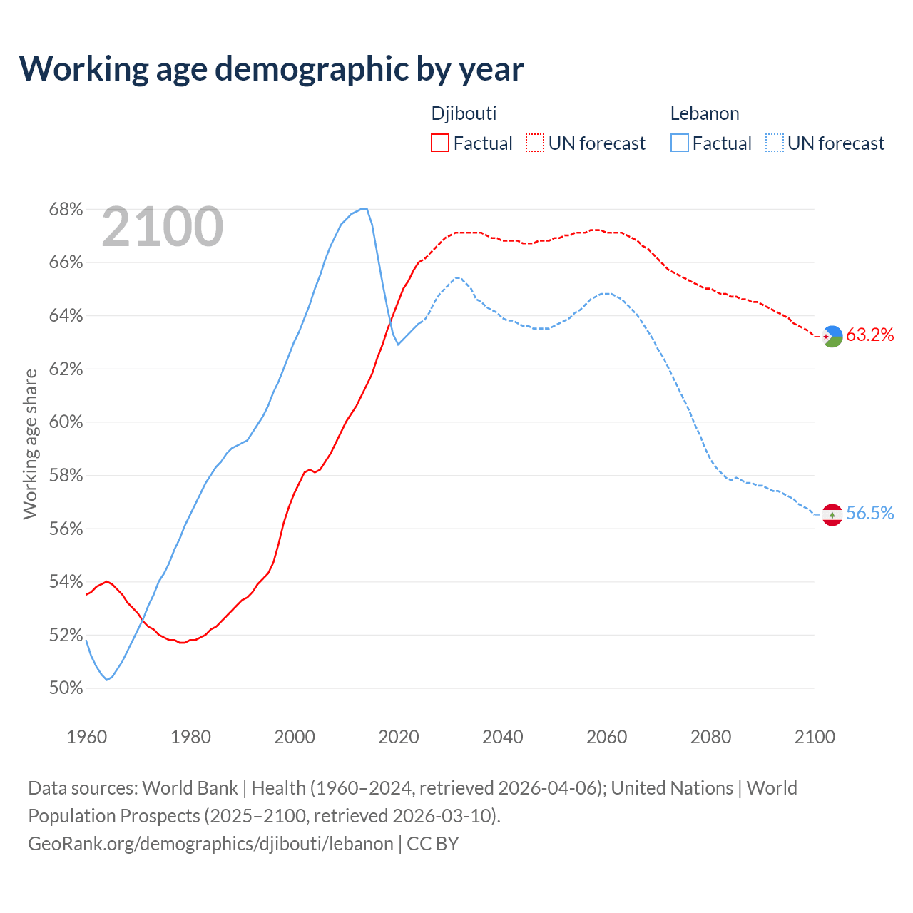 Median age Djibouti vs Lebanon, 1960-2100