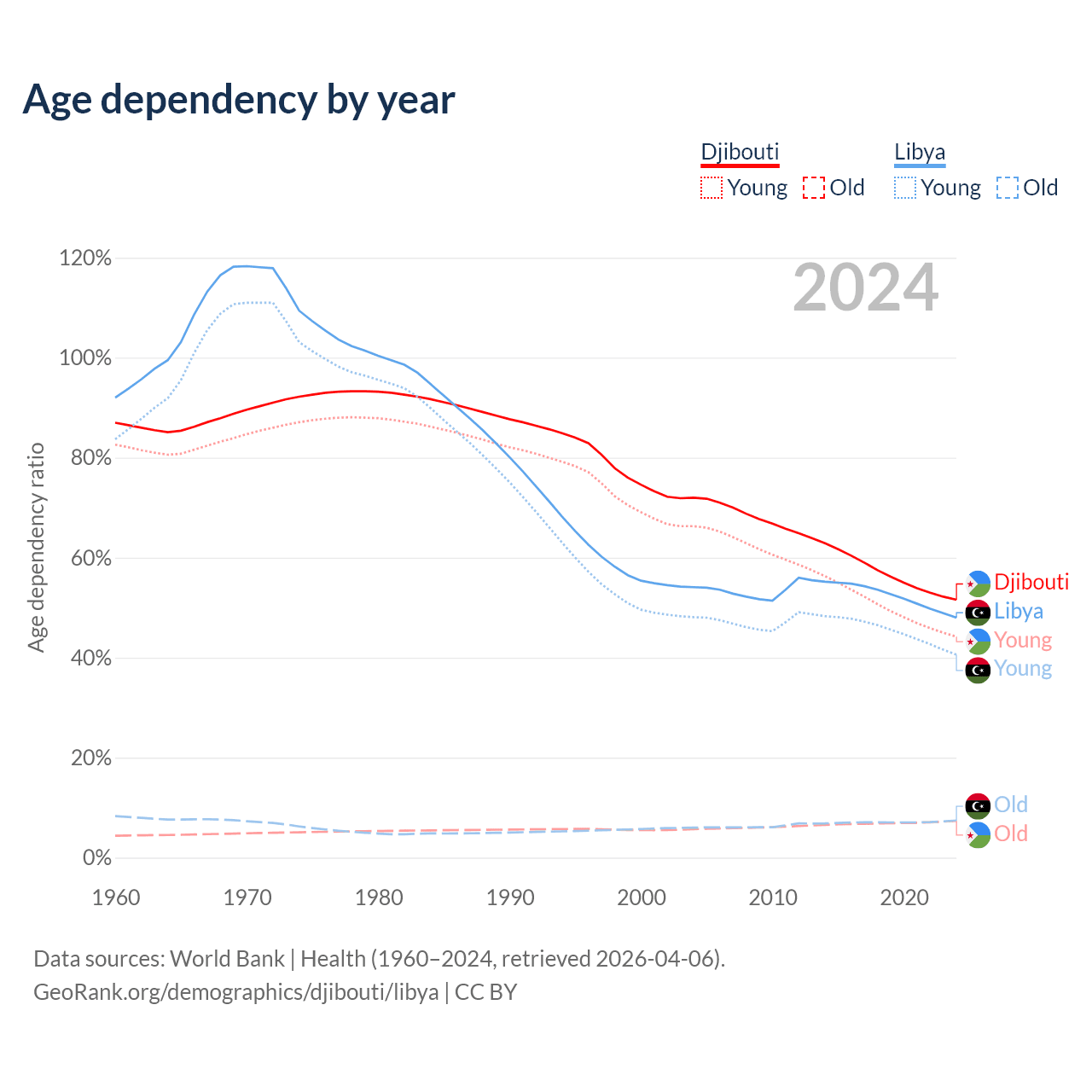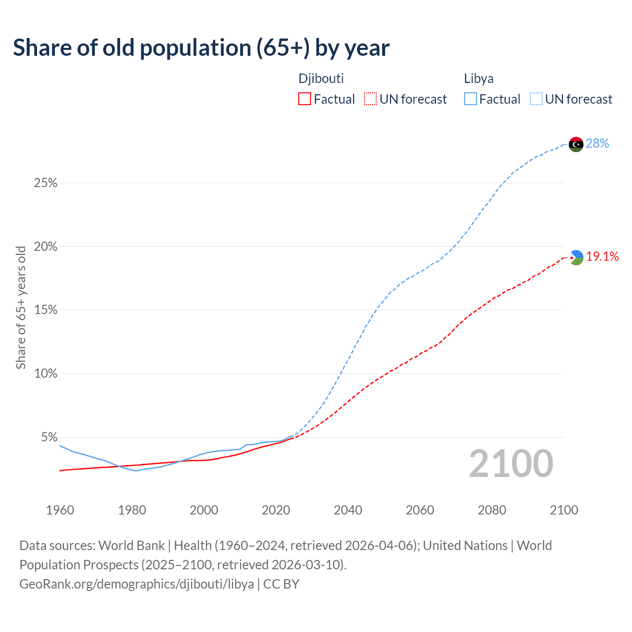 - The share of old-age demographic (65+) in Djibouti is 4.85% vs 5.02% in Libya.