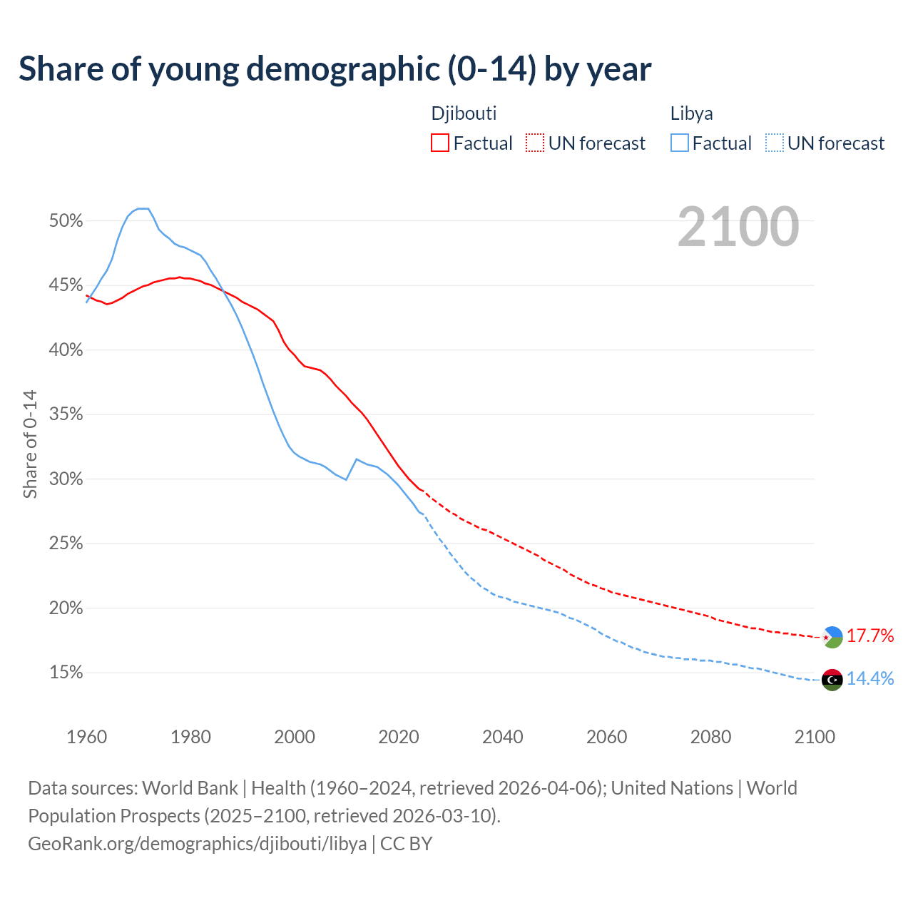 - The share of young demographic (0-15 years old) in Djibouti is 29.2% vs 27.4% in Libya.