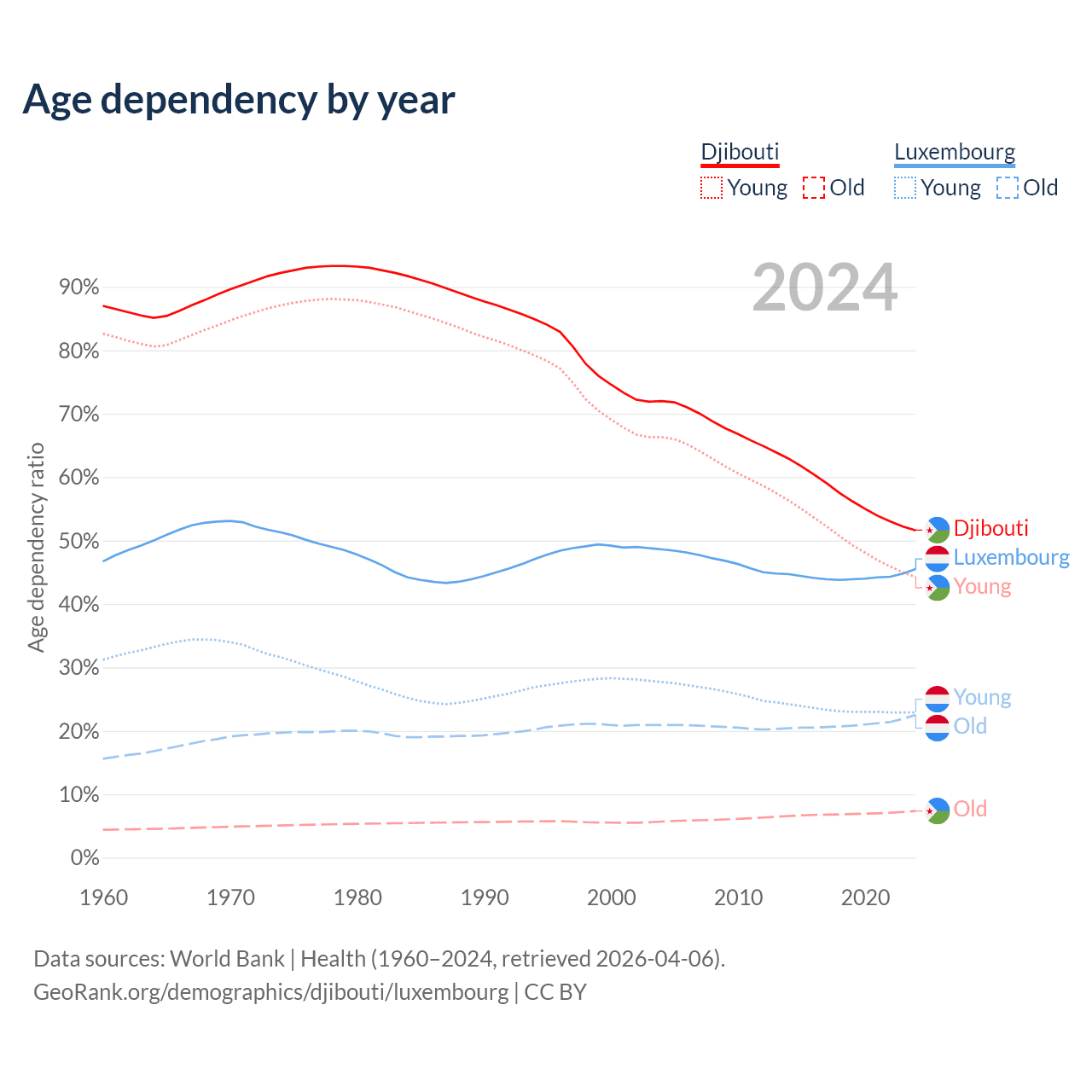 - The share of old-age demographic (65+) in Djibouti is 4.85% vs 15.5% in Luxembourg.