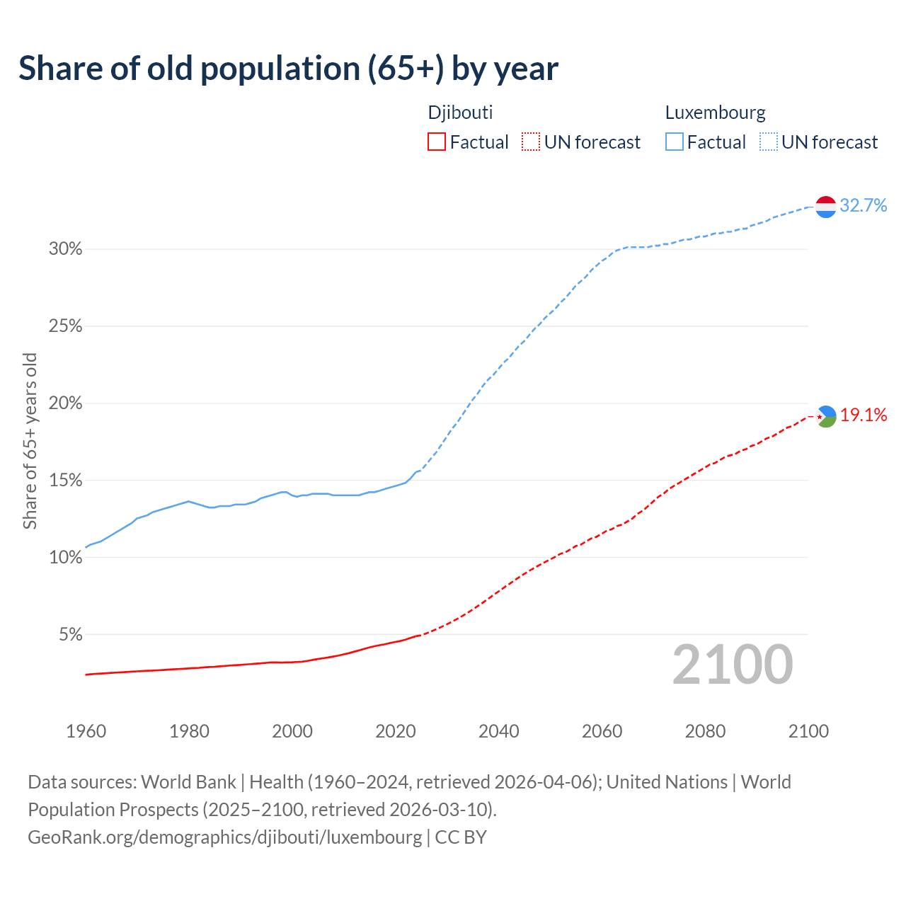 The share of older people aged 65 and over is 4.85% in Djibouti and 15.5% in Luxembourg. Life expectancy in Djibouti compared to Luxembourg .