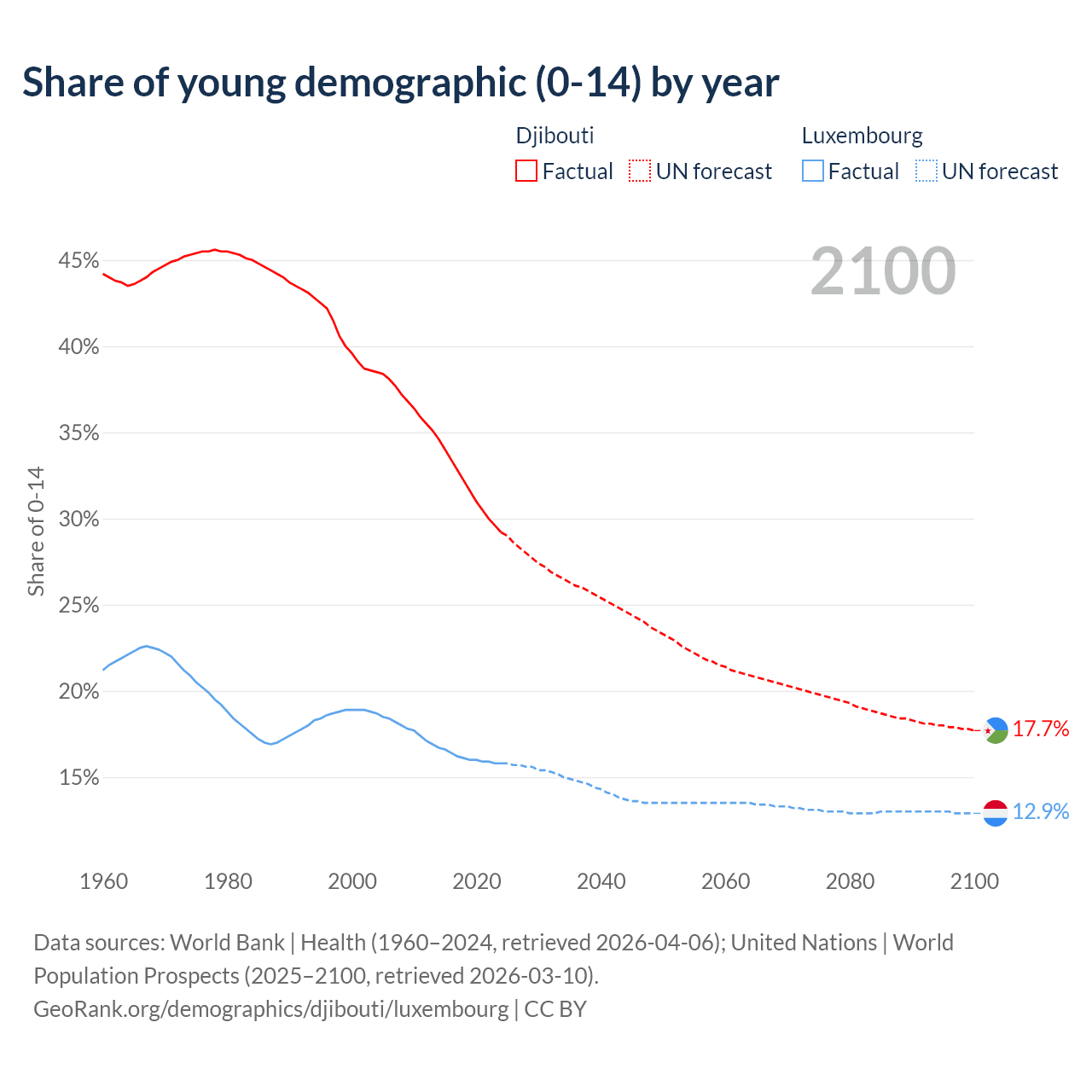 - The share of young demographic (0-15 years old) in Djibouti is 29.2% vs 15.8% in Luxembourg.