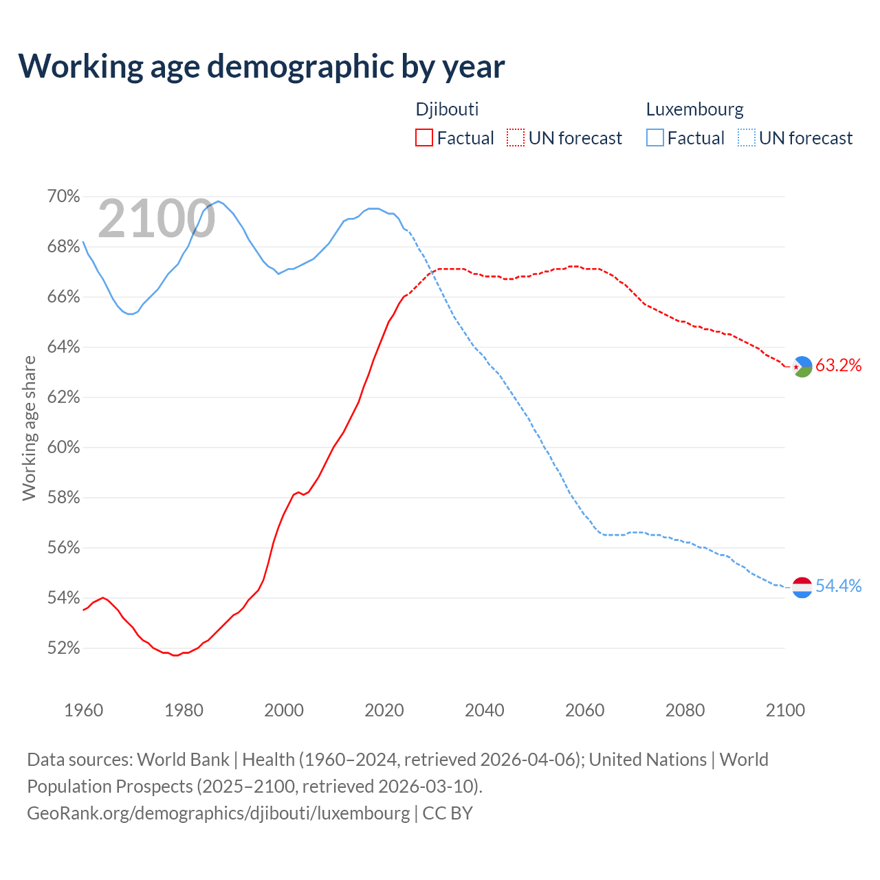 - Djibouti has 794K working age adults (aged 15-64) vs 477K in Luxembourg.