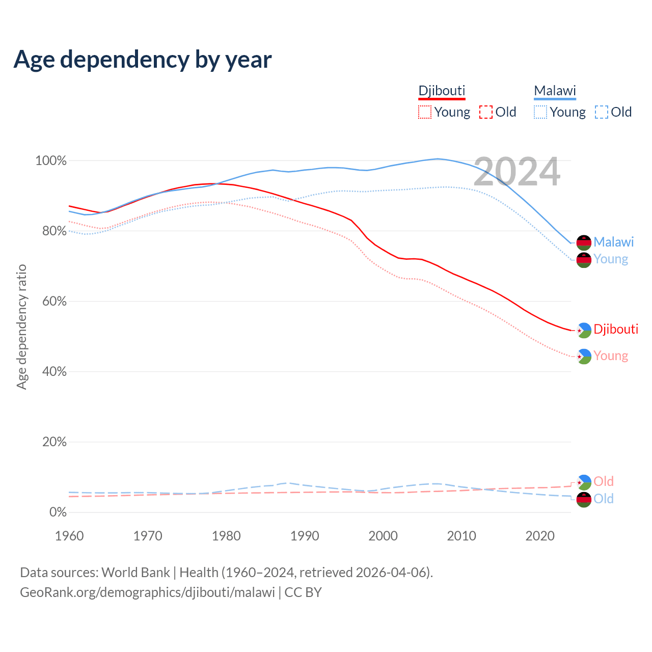 - Djibouti is ranked 129/196 by median age (oldest to youngest) vs 181/196 for Malawi.