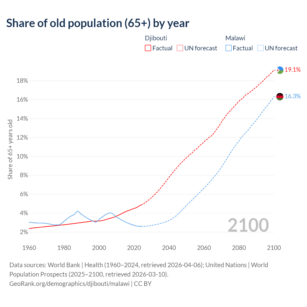 - The share of old-age demographic (65+) in Djibouti is 4.85% vs 2.59% in Malawi.
