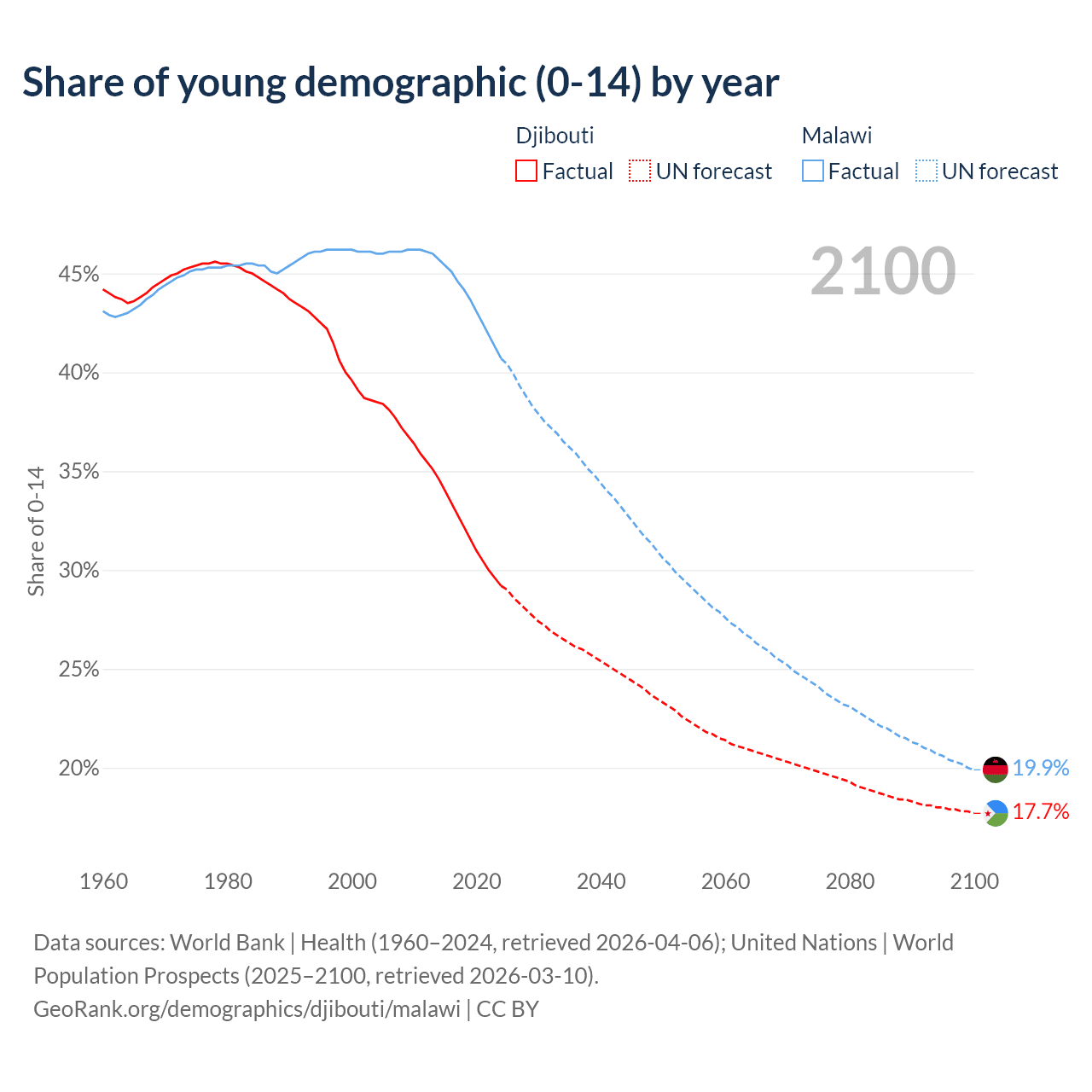 - The share of young demographic (0-15 years old) in Djibouti is 29.2% vs 40.7% in Malawi.