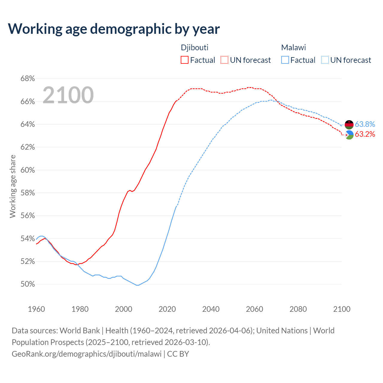 Median age Djibouti vs Malawi, 1960-2100