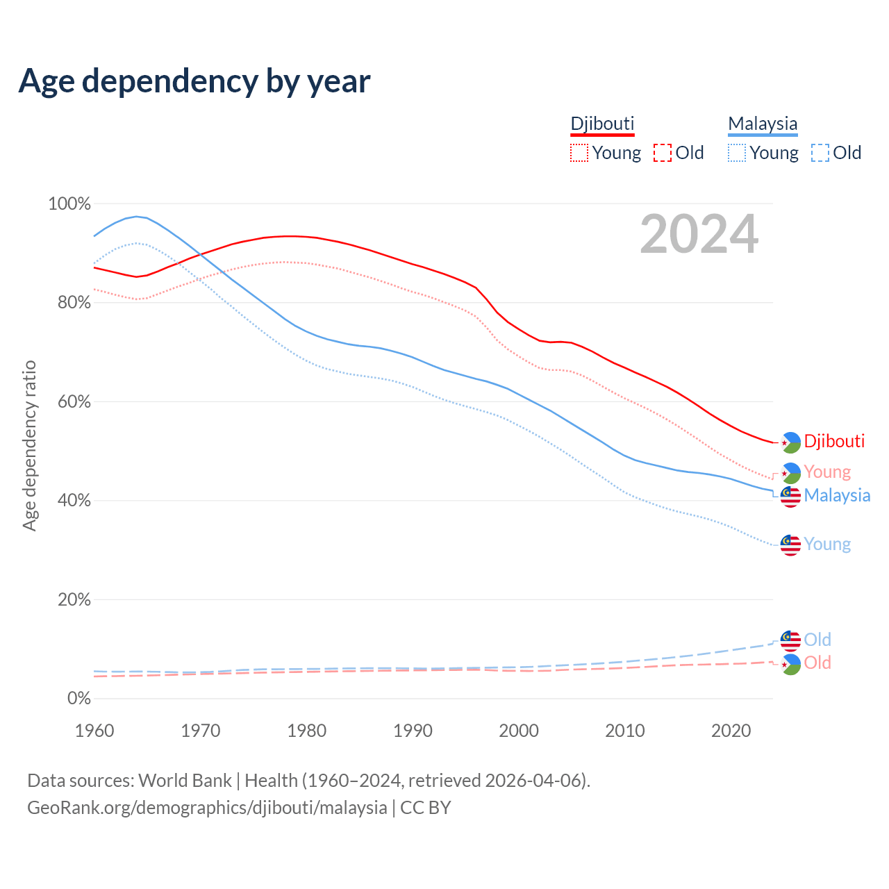- The share of old-age demographic (65+) in Djibouti is 4.85% vs 7.74% in Malaysia.