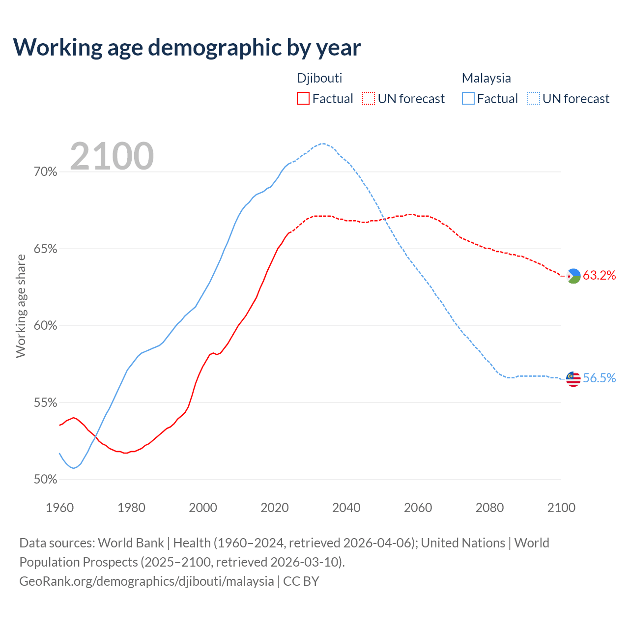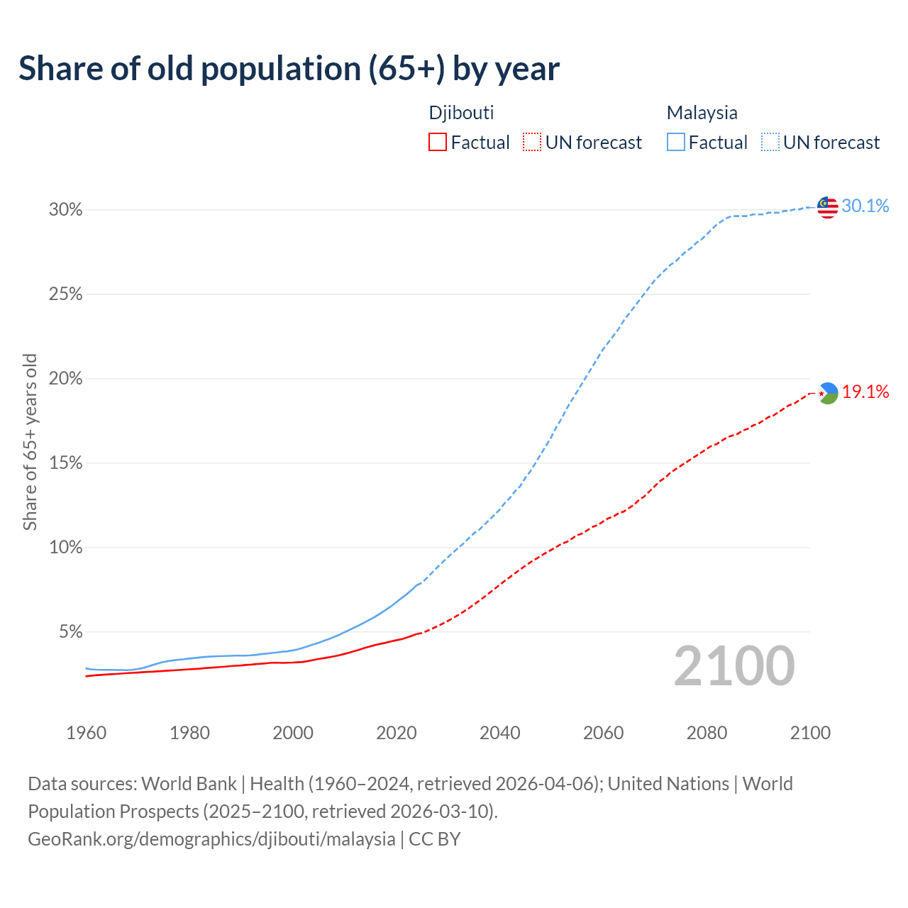 The share of older people aged 65 and over is 4.85% in Djibouti and 7.74% in Malaysia. Life expectancy in Djibouti compared to Malaysia .