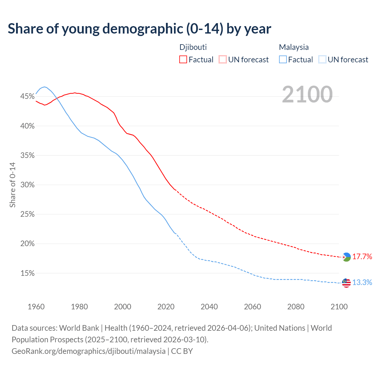 - The share of young demographic (0-15 years old) in Djibouti is 29.2% vs 21.8% in Malaysia.