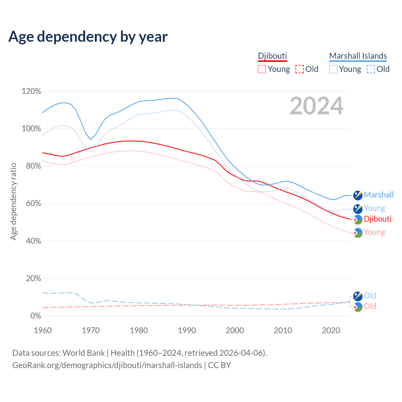 - Djibouti is ranked 129/196 by median age (oldest to youngest) vs 150/196 for the Marshall Islands.