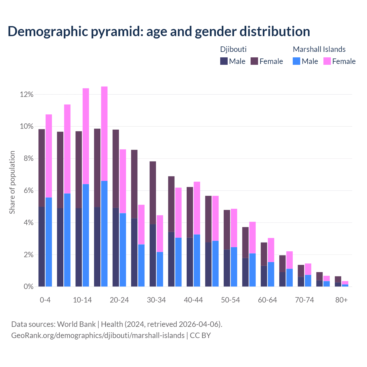 - As of 2026, the population of Djibouti is 1.2M vs 35.1K in the Marshall Islands - 34.3 times difference.