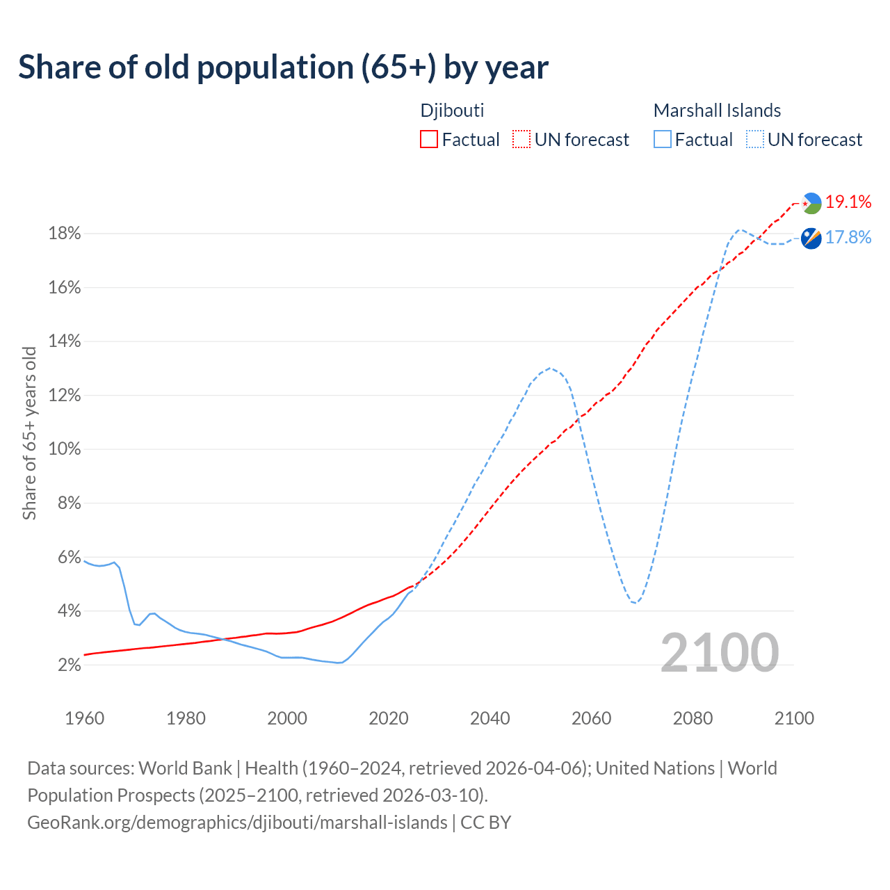 - The share of old-age demographic (65+) in Djibouti is 4.85% vs 4.64% in the Marshall Islands.