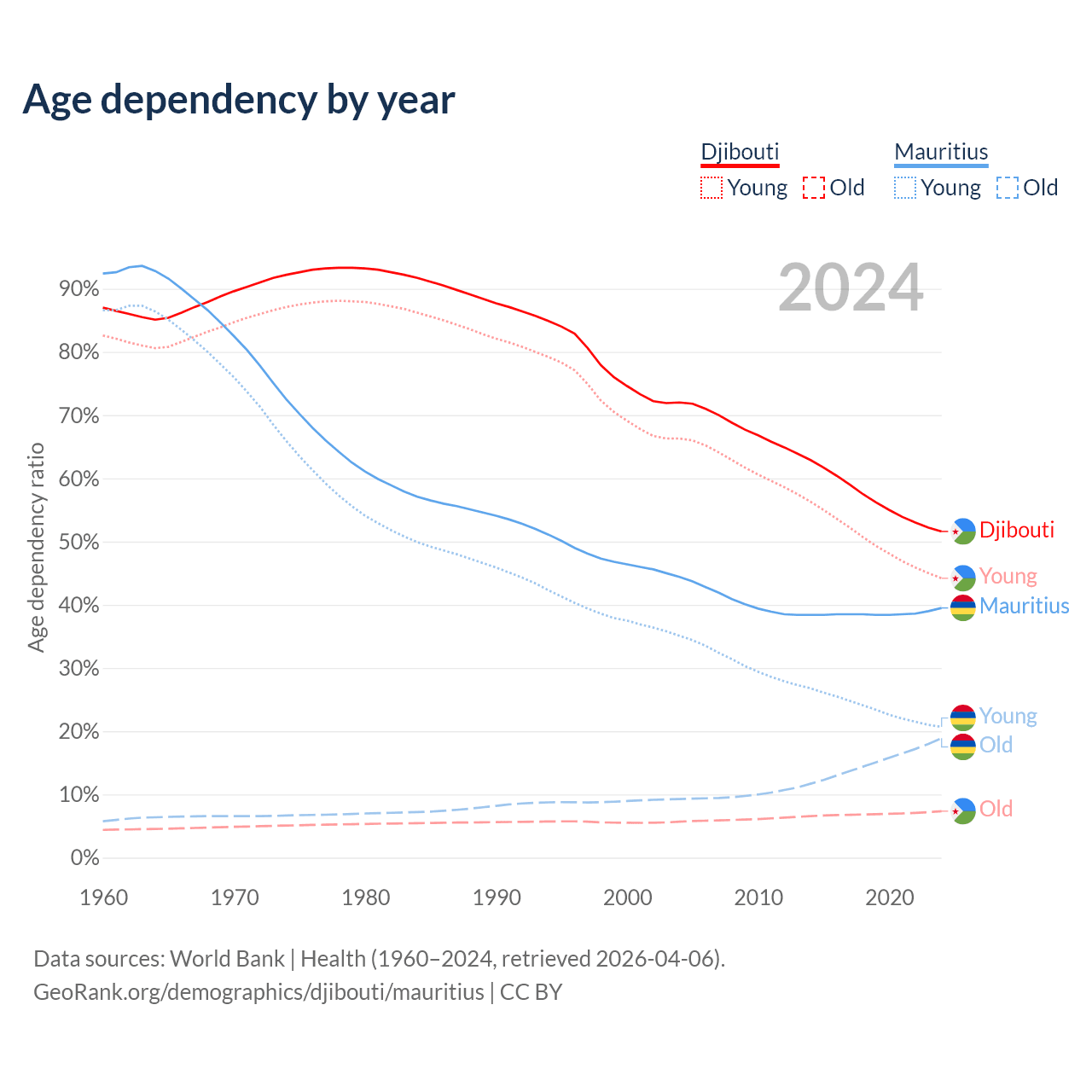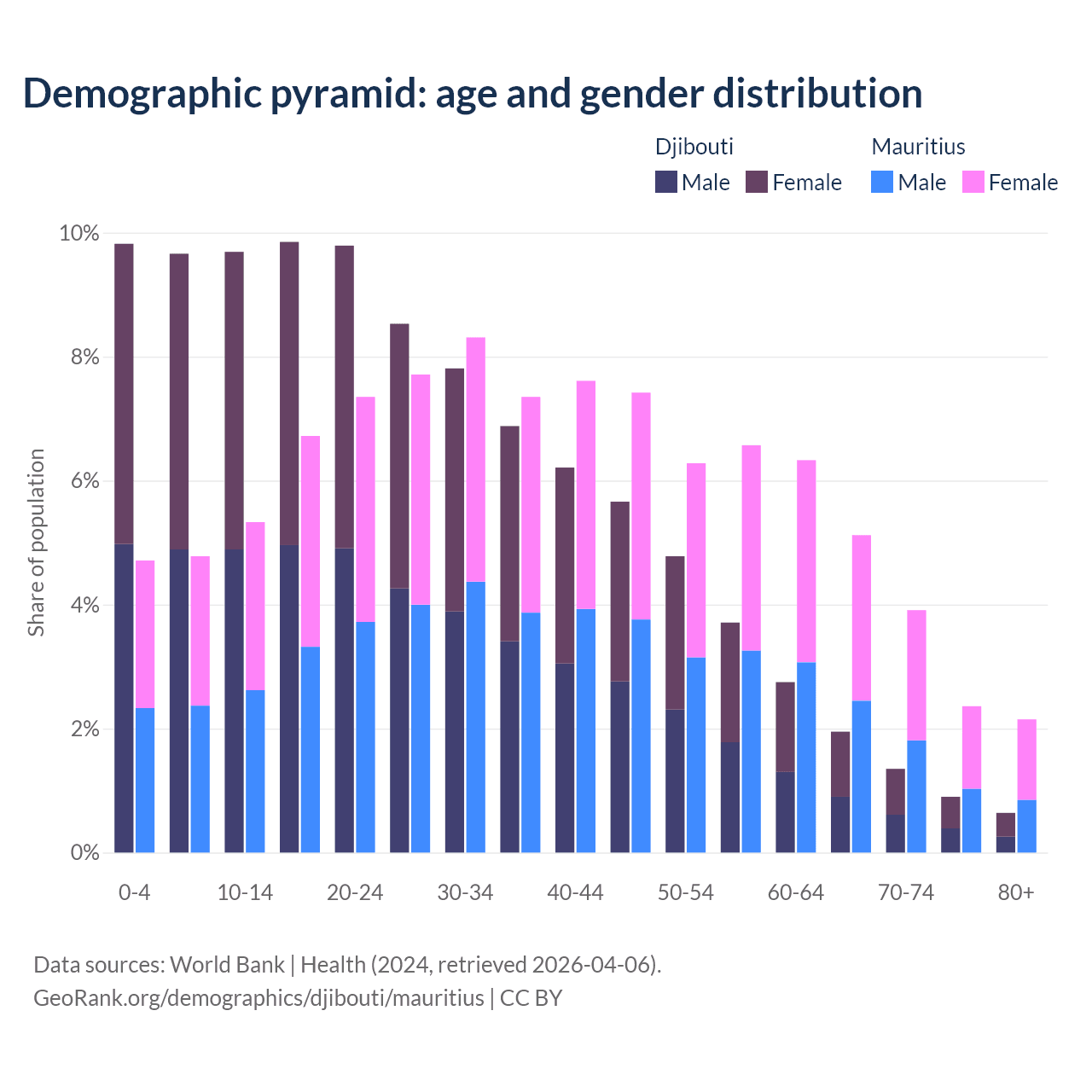 - Djibouti is ranked 129/196 by median age (oldest to youngest) vs 57/196 for Mauritius.